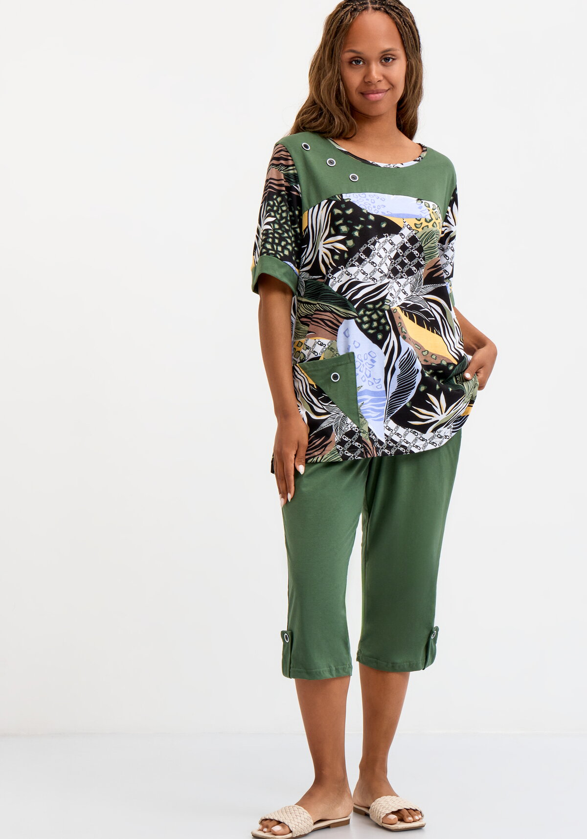 Костюм повседневный из набивного и однотонного трикотажного полотна. Футболка с круглой горловиной окантована узким кантом. Рукава втачные, внизу на манжете. На полочке футболки вверху кокетка из однотонного полотна, с тремя декоративными пуговицами. Внизу полочки сбоку расположен накладной карман из однотонного и набивного полотна. На кармане для декора пришита пуговица. Спинка цельнокроеная. Бриджи прямые с карманами. Пояс на резинке. Низ с патами на пуговице. Модель представлена в двух цветах: графитовый и зеленый.