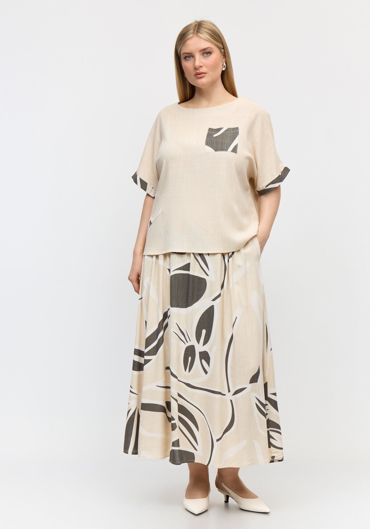 Откройте для себя гармонию комфорта и элегантности с костюмом из свободной блузы с коротким рукавом и накладным карманом и юбки свободного кроя с завораживающим абстрактным принтом — этот комплект преобразит ваш повседневный образ. Выполненный из мягкой 100% вискозы, он подарит приятные ощущения на коже и обеспечит свободу движений в течение всего дня. Лёгкий, стильный и невероятно удобный, этот наряд станет вашей любимой находкой для создания выразительных повседневных луков!