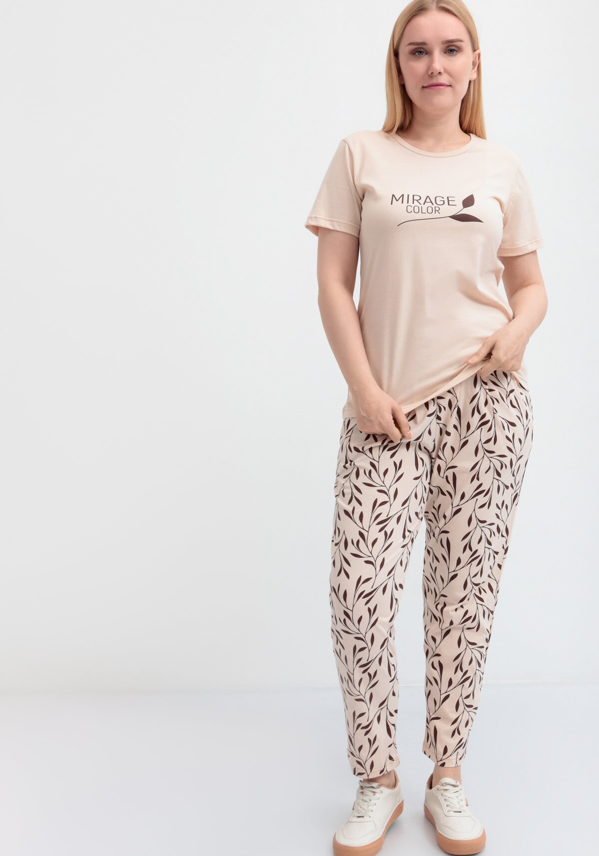 Костюм состоит из футболки и брюк. Футболка прямого покроя с коротким втачным рукавом. Круглый вырез горловины окантован. Брюки длинные, зауженные к низу, с кокеткой спереди и карманами в боковых швах. Карманы с подкройным бочком. Из-под кокетки выходят по две мягкие складки с каждой стороны. Пояс цельнокроеный с резинкой. Модель представлена в четырех цветах: молочный, сиреневый, синий, черный.