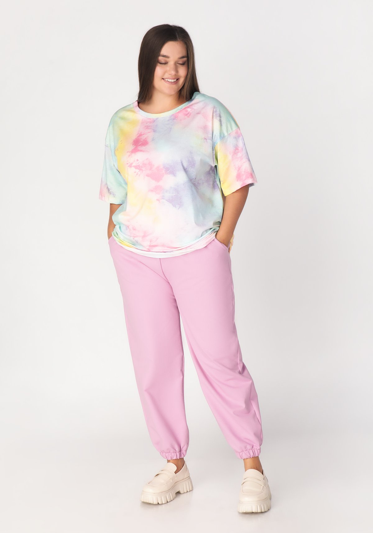 Комфортный костюм для дома, спорта, отдыха и просто повседневной носки: футболка фасона «оверсайз» с актуальным принтом «тай-дай» + зауженные брюки с манжетами. Функциональные карманы. Приятный к телу натуральный хлопок. Яркие расцветки.