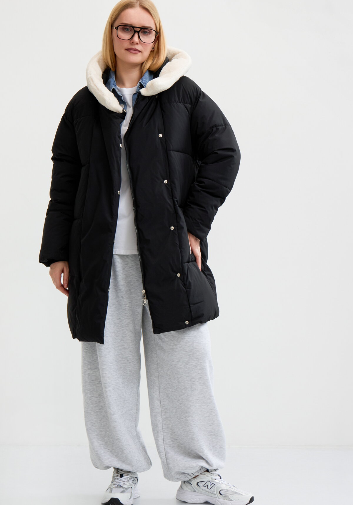 Удлиненная зимняя куртка с поясом и капюшоном-трубой. Выполнена из износостойкой ткани с премиальным утеплителем, надежно защищает от ветра и холода при температуре до −25 °C. Оснащена скрытыми карманами на молнии и застёжкой на молнии с кнопками.