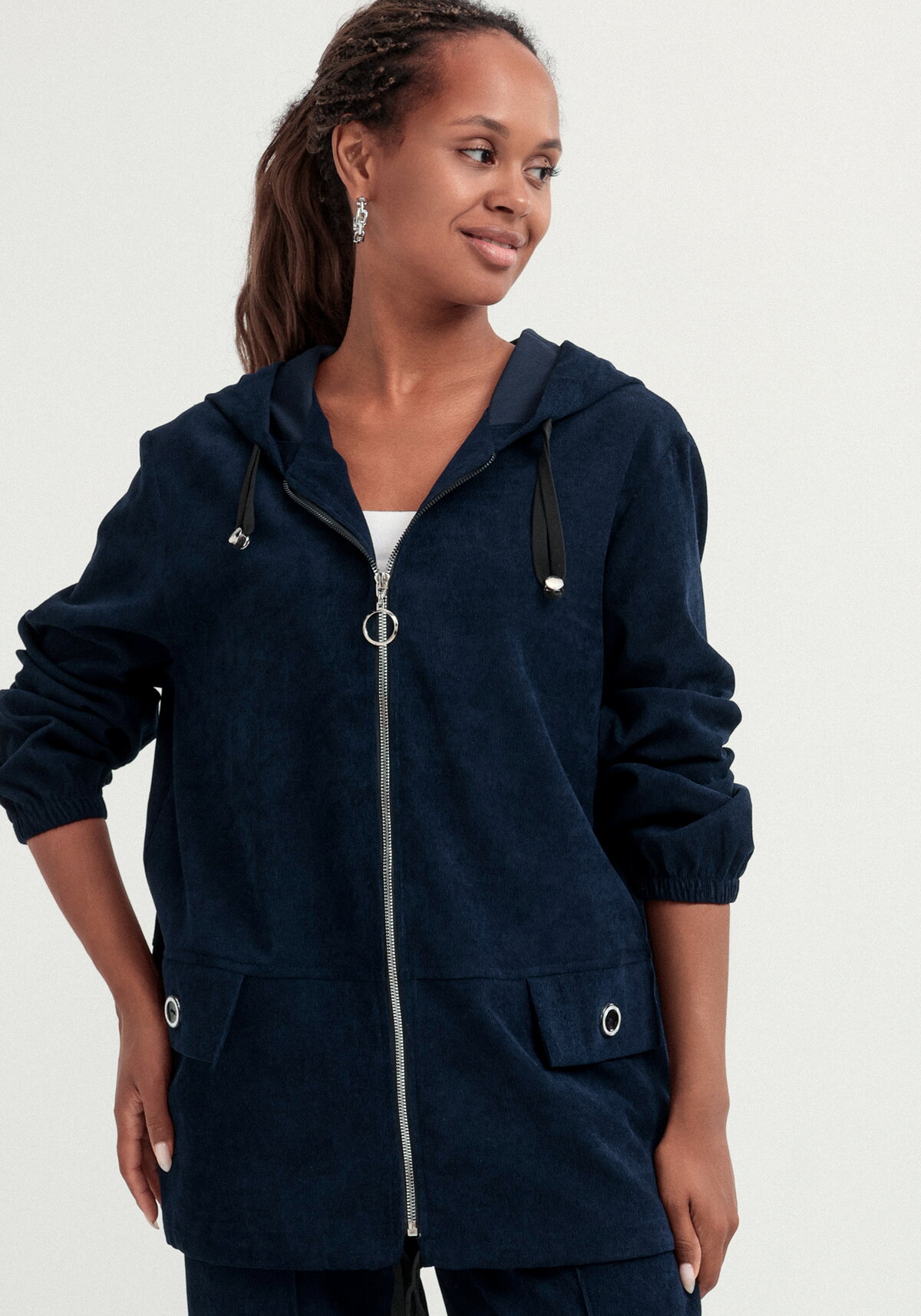 Ветровка свободного покроя. Перед с подрезом внизу. С карманами в подрезе и клапанами на пуговицу. С капюшоном, замком по переду. Капюшон и низ изделия на шнурках. Рукав на резинке.