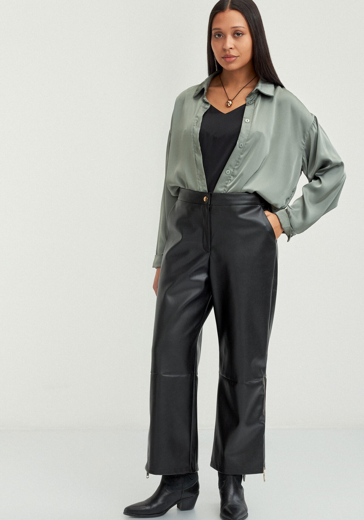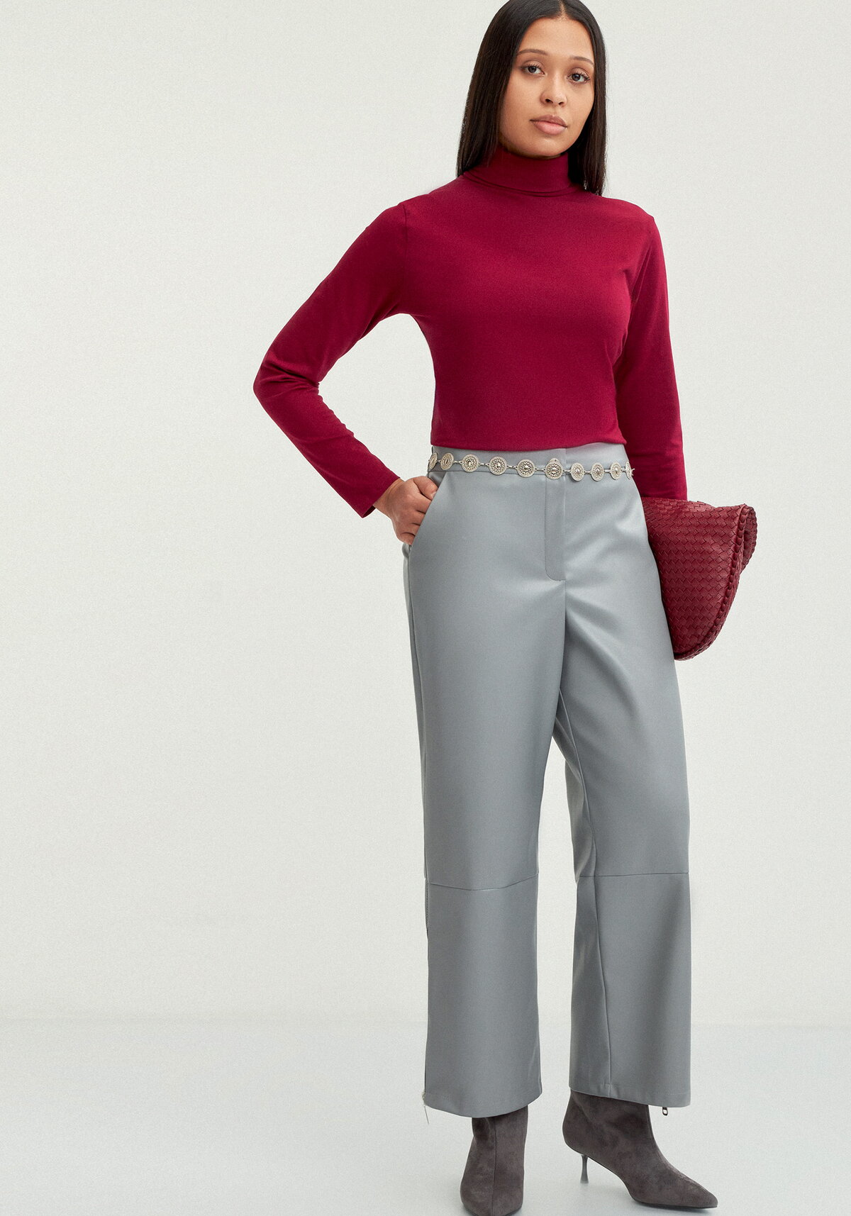 Брюки прямого кроя с легким заужением к низу. Оснащены рабочим гульфиком и поясом с резинкой на спинке. Дизайн дополнен косыми карманами. По боковым швам в нижней части брюк расположены застежки-молнии.