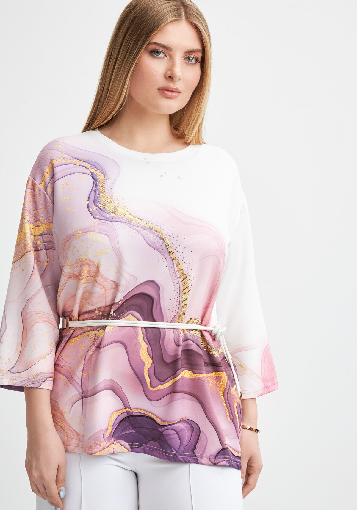 Стильный лонгслив свободного кроя — универсальная база для модных образов! Модель отличается комфортным силуэтом, который не сковывает движений и подходит для разных типов фигуры. Округлый вырез горловины выглядит лаконично и элегантно, а яркий принт придает вещи индивидуальность. Отсутствие застёжки обеспечивает дополнительную свободу и удобство в носке.