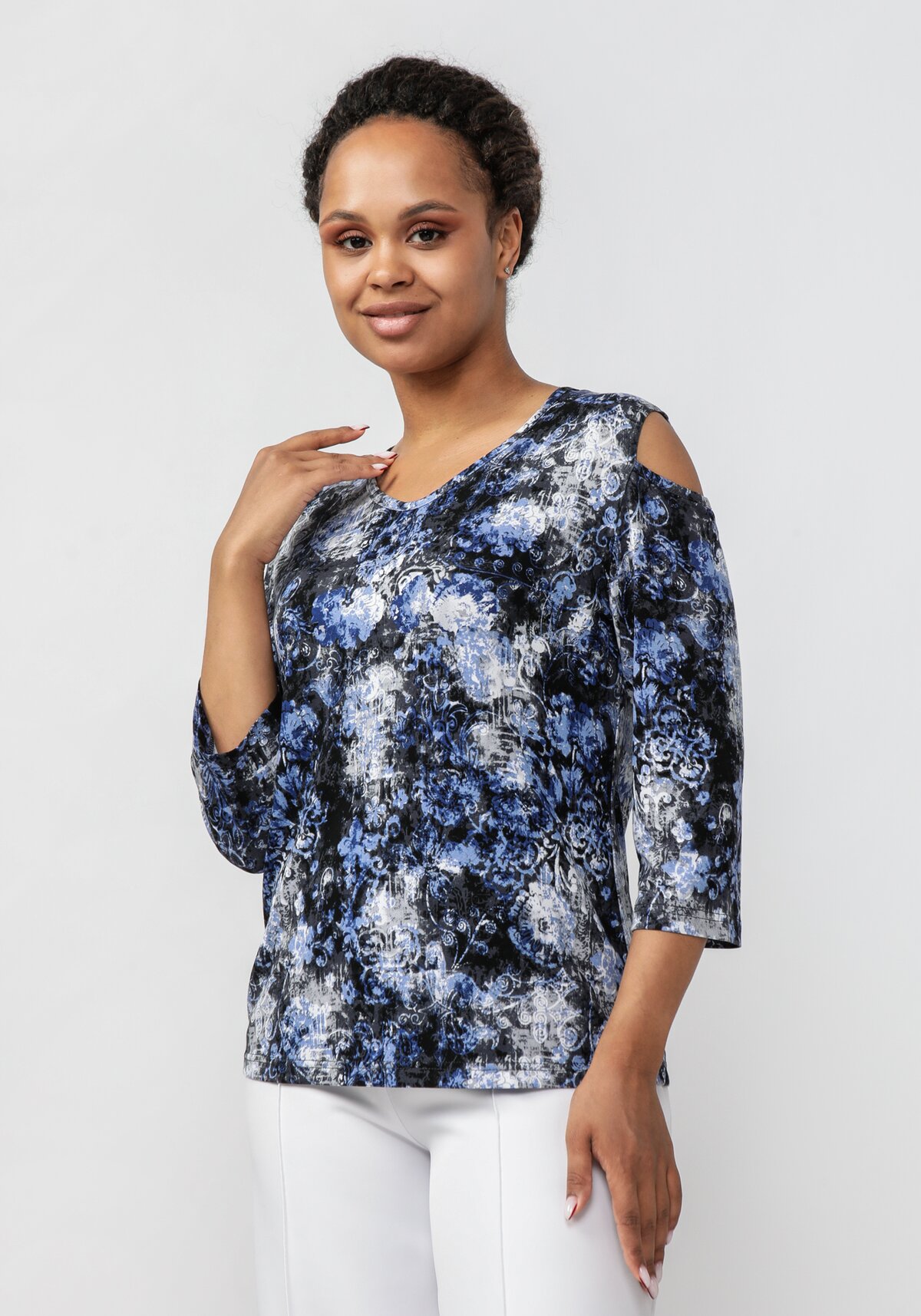 Эффектная вискозная блуза с оригинальными разрезами на плечах. Рукав 3/4. Широкий ассортимент интересных принтов. Блуза хорошо сочетается с однотонным низом разного фасона.