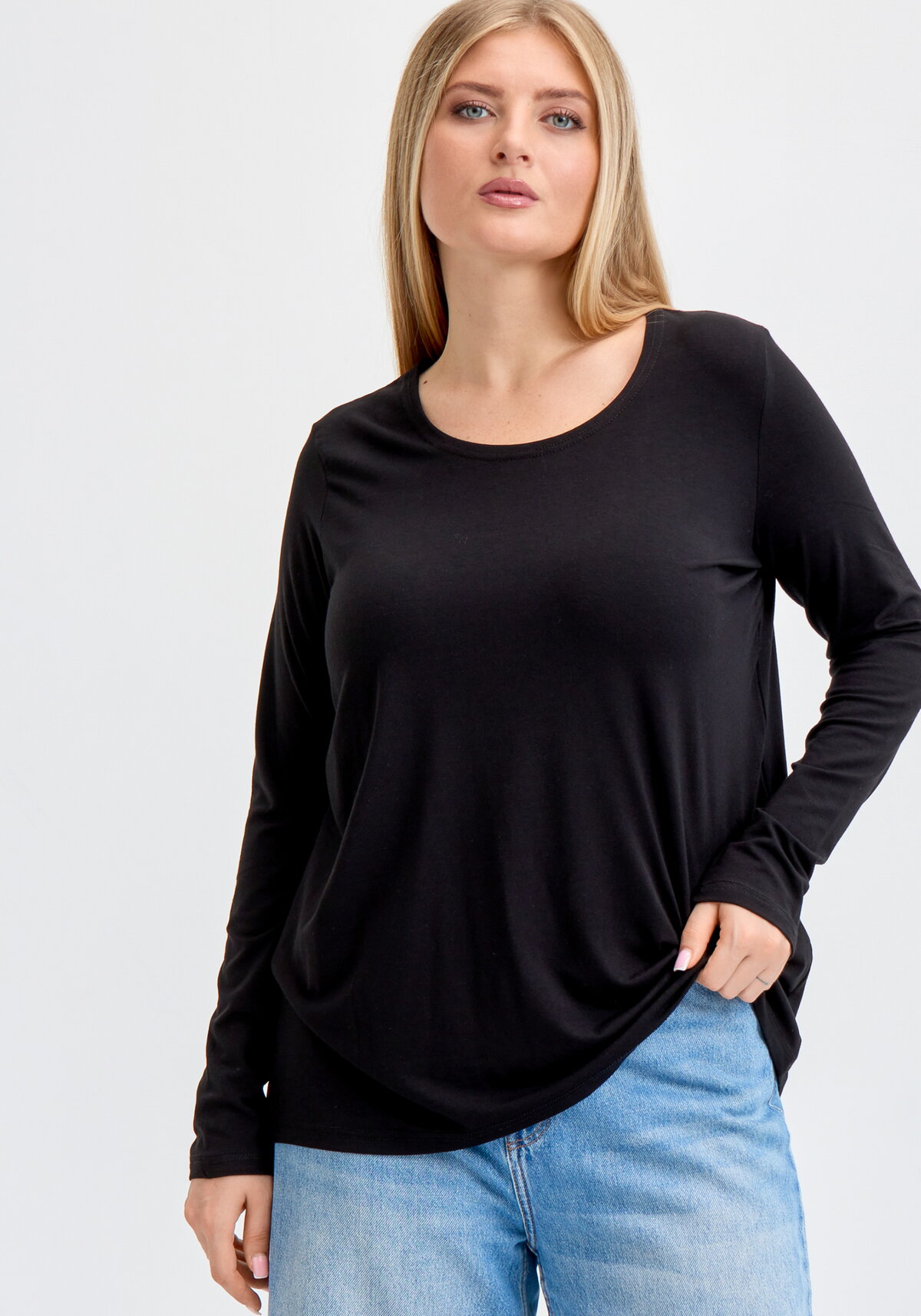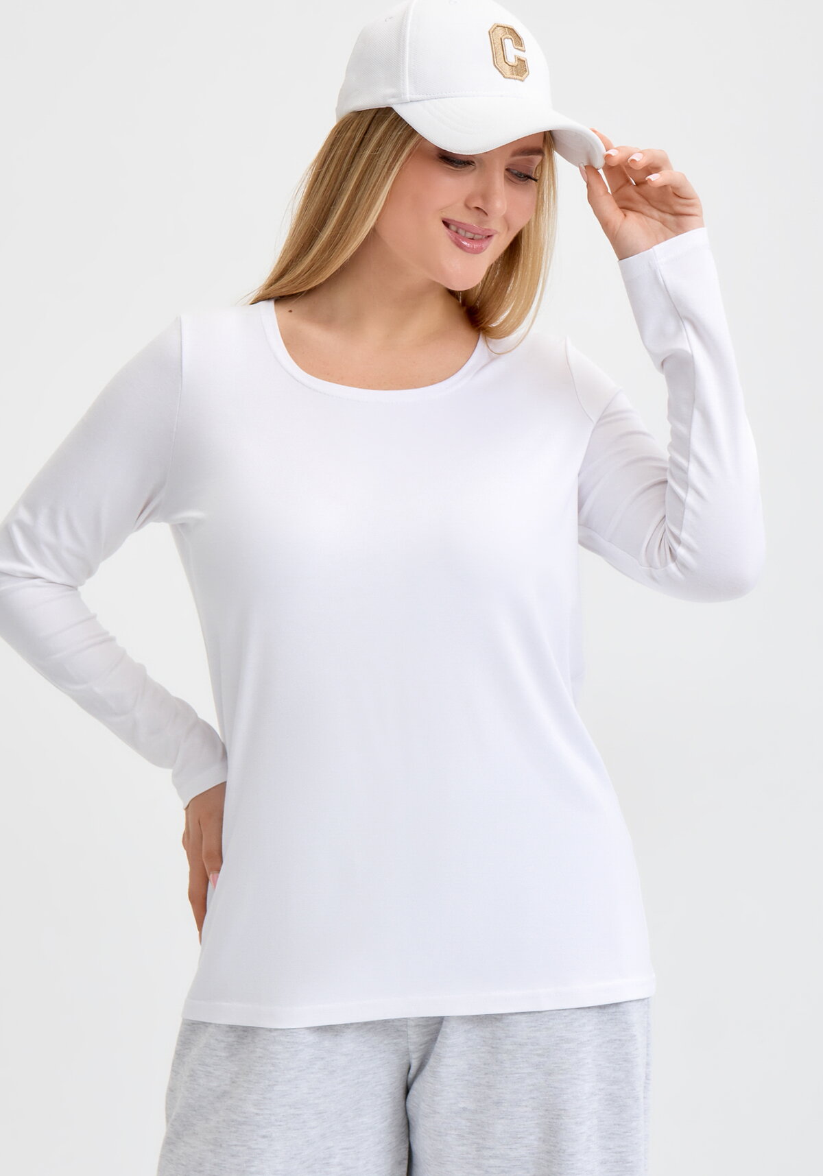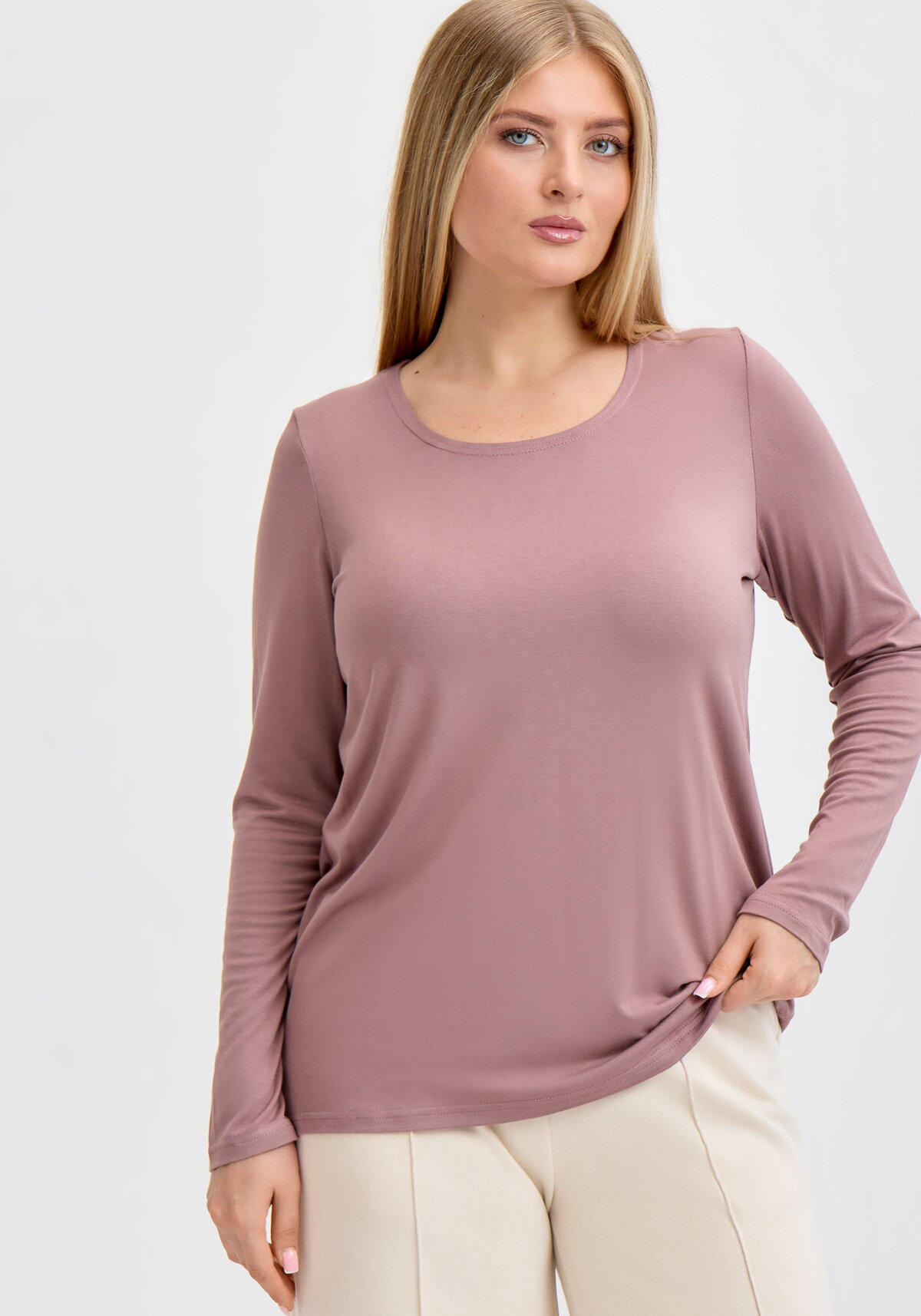 Блузка прилегающего силуэта, длиной до середины бедер из трикотажного полотна. Полочка и спинка без конструктивных линий. Вырез овальный. Рукав втачной, одношовный, длинный. Низ изделия, рукавов и горловина подшиты плоским швом.