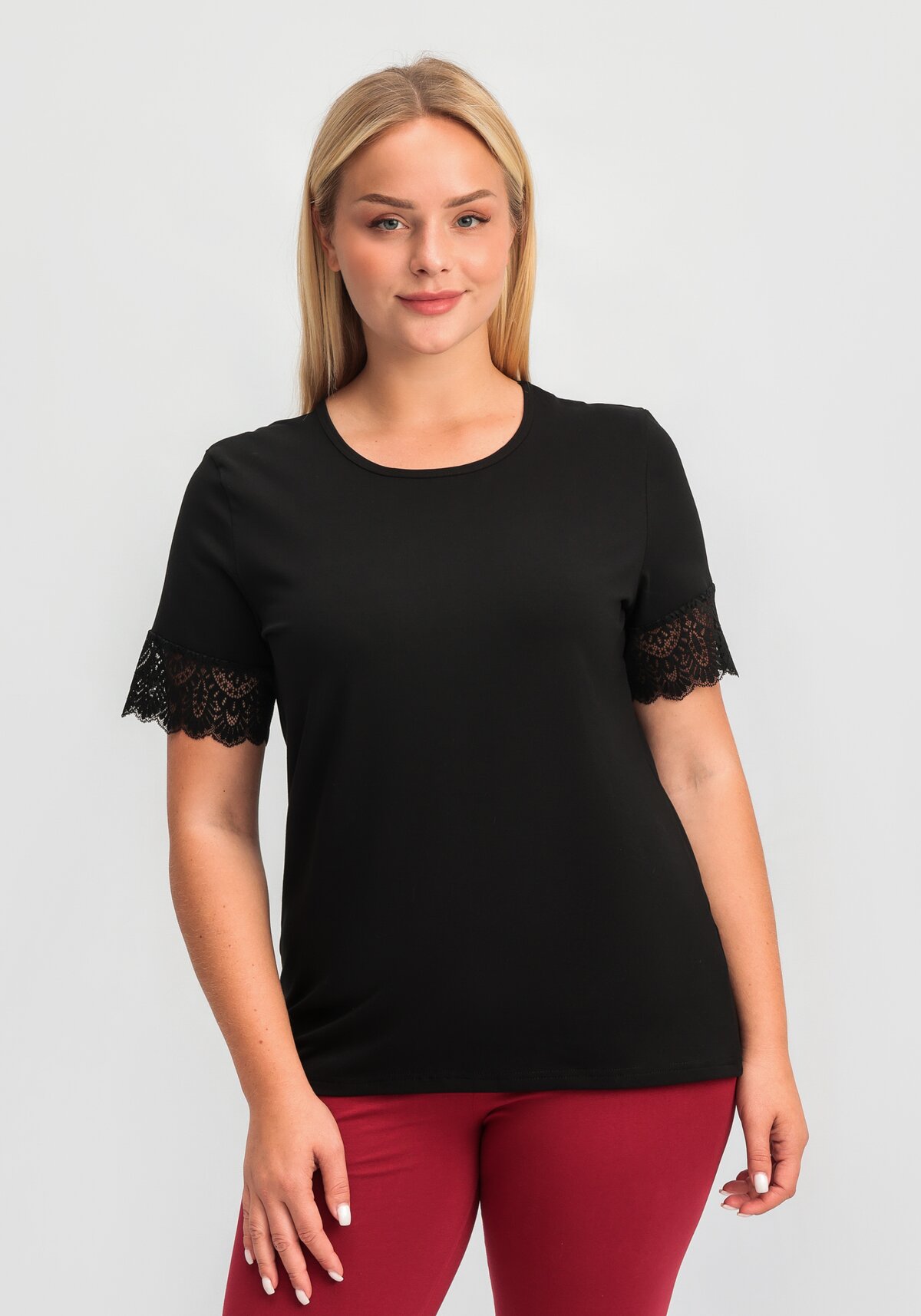 Прекрасный вариант для повседневного образа. Гигиеничный хлопковый трикотаж идеально подходит для любого сезона. Элегантное мягкое кружево на рукавах и вороте придает образу женственность и нежность. Базовая приталенная футболка - необходимая вещь в гардеробе каждой женщины.