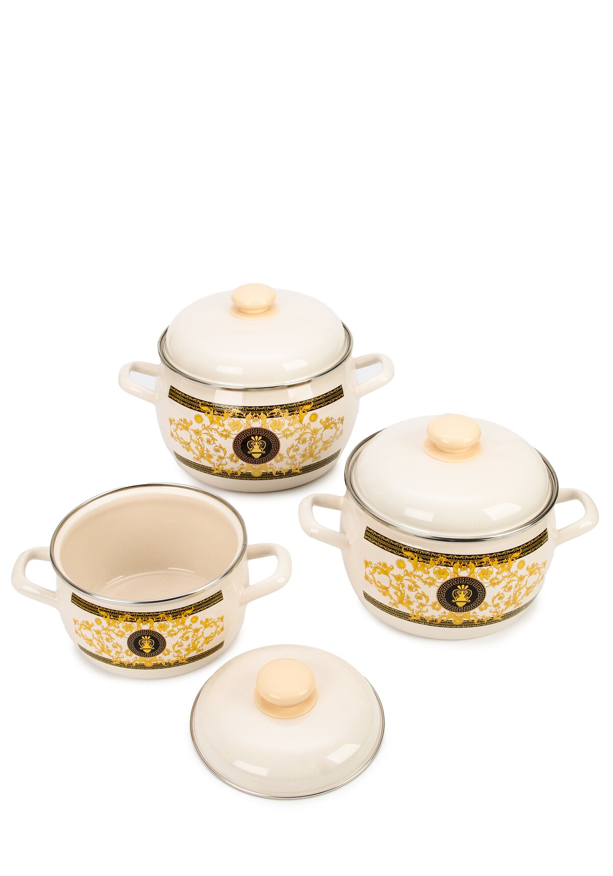 Набор из 3 кастрюль с крышками украшен принтом в греческом стиле. Прочный корпус из стали с тройным слоем эмалевого покрытия гарантирует эффективную тепловую обработку пищи. Стильный комплект посуды станет украшением вашей кухни.