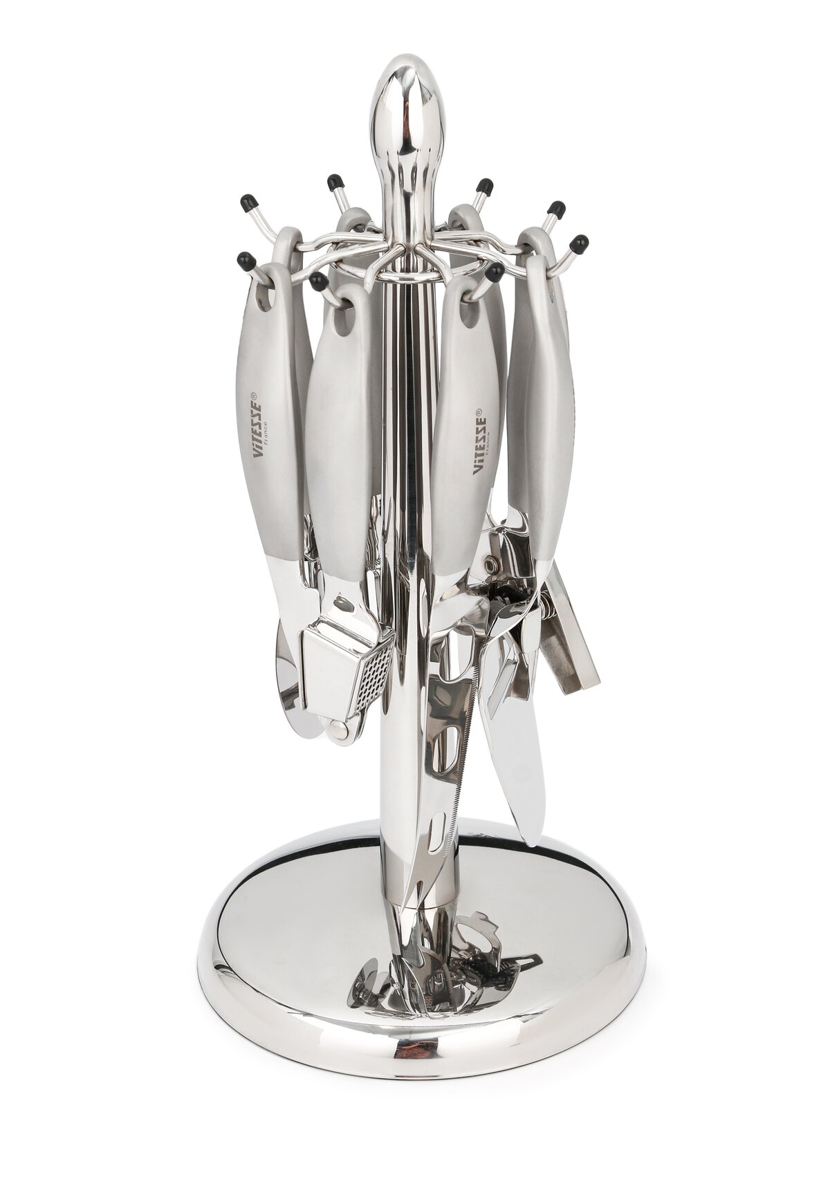 Набор кухонных принадлежностей ― практичное приобретение для вашей кухни! С ним готовить любимые блюда станет намного проще и удобнее. Набор включает в себя семь востребованных кухонных принадлежностей: консервный ключ, пресс для чеснока, нож-лопатка для сыра, нож для сыра, нож для пиццы, овощечистка, вращающаяся подставка. Благодаря ей вы сможете легко подвесить принадлежности рядом с другой кухонной утварью, чтобы они всегда были у вас на виду.
