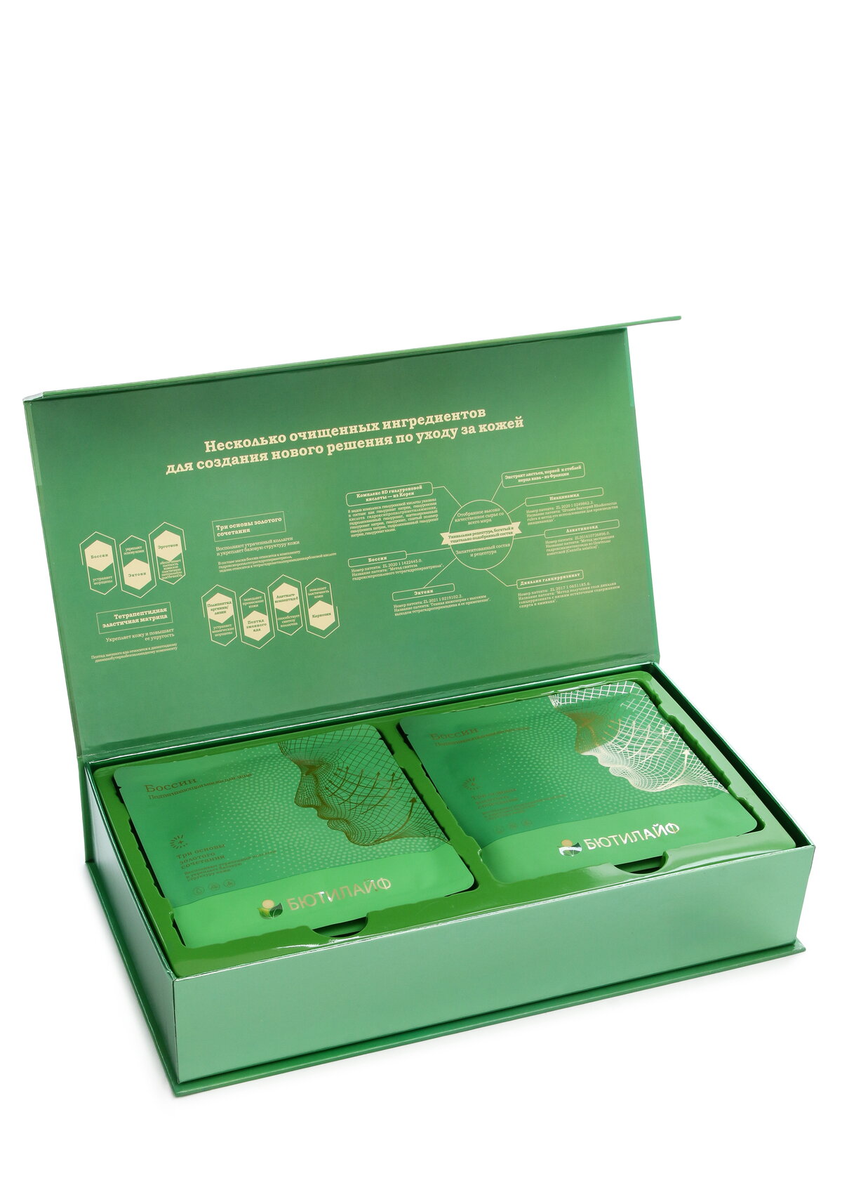 - Запатентованные ингредиенты премиум-класса: Боссин, Эктоин, Эрготион, Ниацинамид, Азиаткозид, Глицирризинат калия (патенты КНР)
