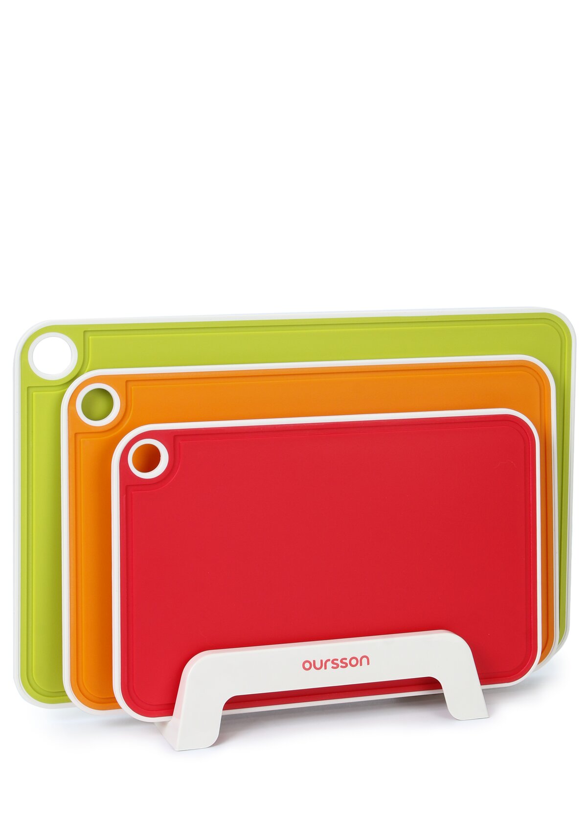 Набор из трех ярких разделочных досок на подставке станет украшением вашей кухни! Доски имеют специальные желобки, благодаря которым сок продуктов не стекает на рабочую поверхность. По периметру доски отделаны антискользящим материалом, что обеспечивает их прочное сцепление с поверхностью. У каждой доски есть отверстие для подвешивания. Храниться на подставке они могут как в вертикальном, так и в горизонтальном положении.