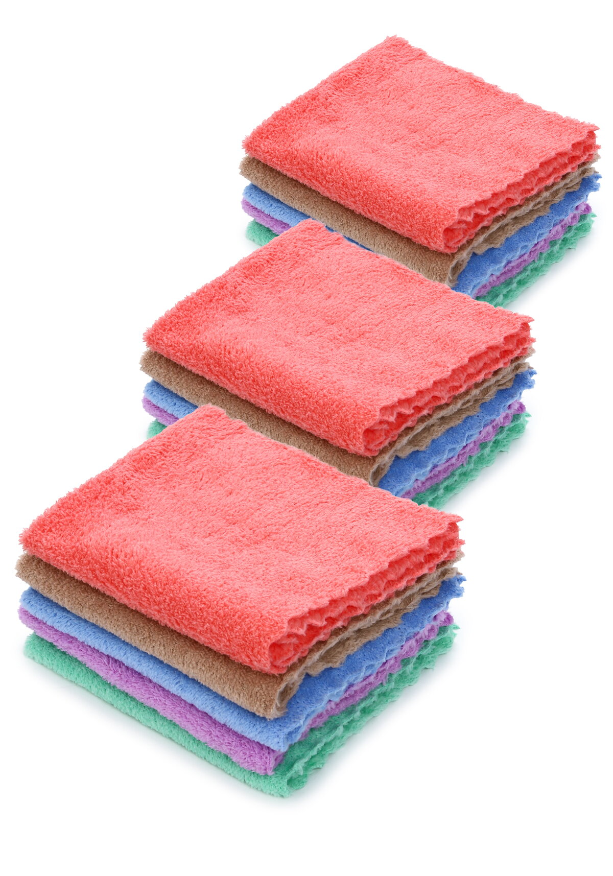 Набор состоит из 15 салфеток (3 шт. каждого из 5 цветов): бежевый, голубой, мятный, розовый, сиреневый. Размер каждой салфетки — 30×30 см. Изготовлены из 100% полиэстера (микрофибра премиум-класса), что обеспечивает высокую впитываемость, мягкость и эффективную очистку стекол, зеркал, экранов и других гладких поверхностей без царапин и разводов.
