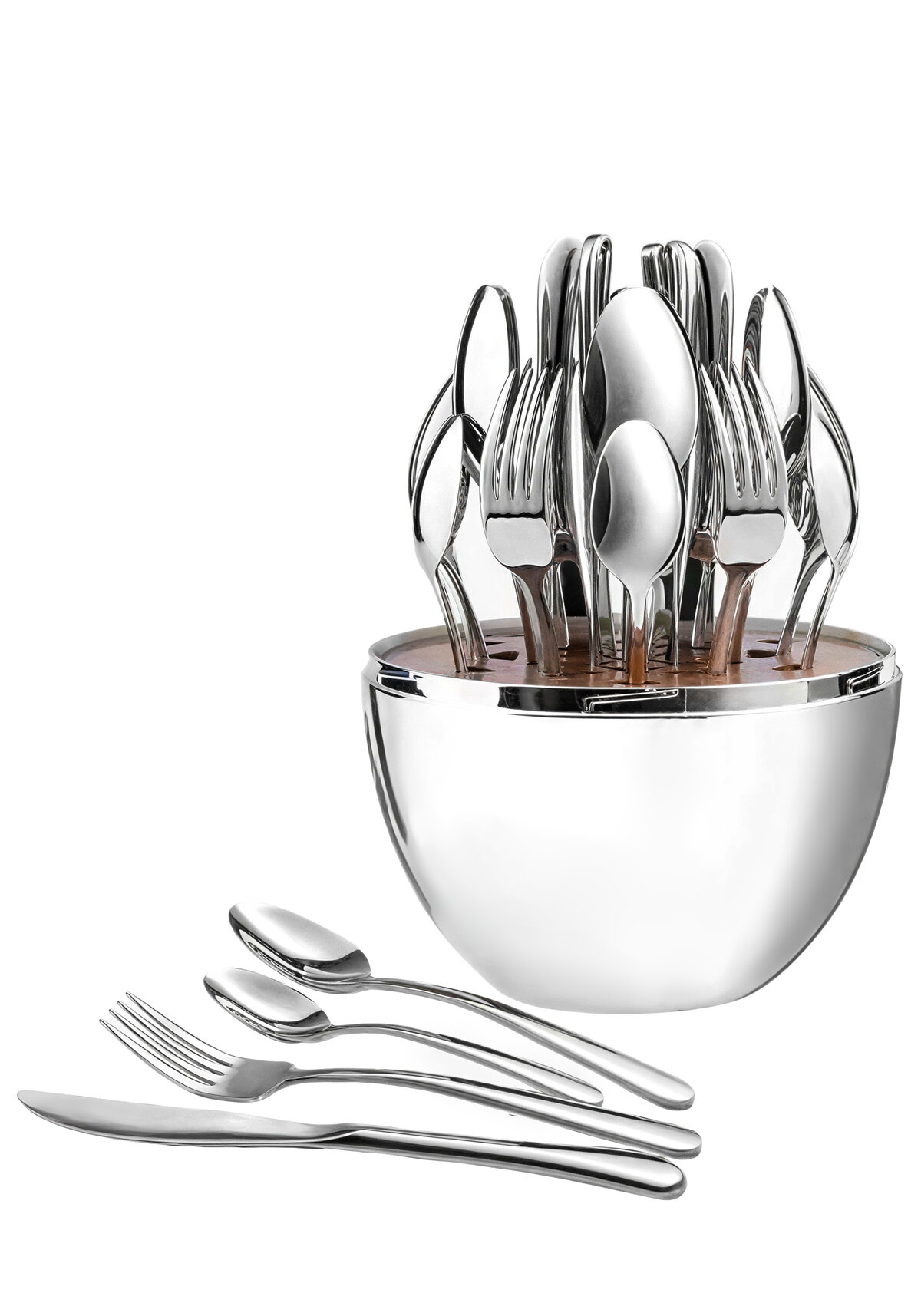 Роскошный набор столовых приборов в подарочной упаковке на 6 персон. Включает в себя 24 предмета: ложки столовые – 6 шт. (длина 21 см), вилки столовые – 6 шт. (длина 21 см), ножи столовые – 6 шт. (длина 21с м), ложки чайные – 6 шт. (длина 15 см). Каждый столовый прибор является настоящим произведением искусства. Они изготовлены из высококачественной нержавеющей стали, что гарантирует их прочность и долговечность. Пищевая нержавеющая сталь не имеет запаха и сохраняет вкус и аромат продуктов натуральными. Имеют эргономичную форму, что обеспечивает комфорт при использовании и идеальное соприкосновение с вашими пальцами. Набор столовых приборов в подарочной упаковке в форме яйца в золотом или серебряном оттенке – это элегантный выбор для тех, кто ценит качество, стиль и роскошь.