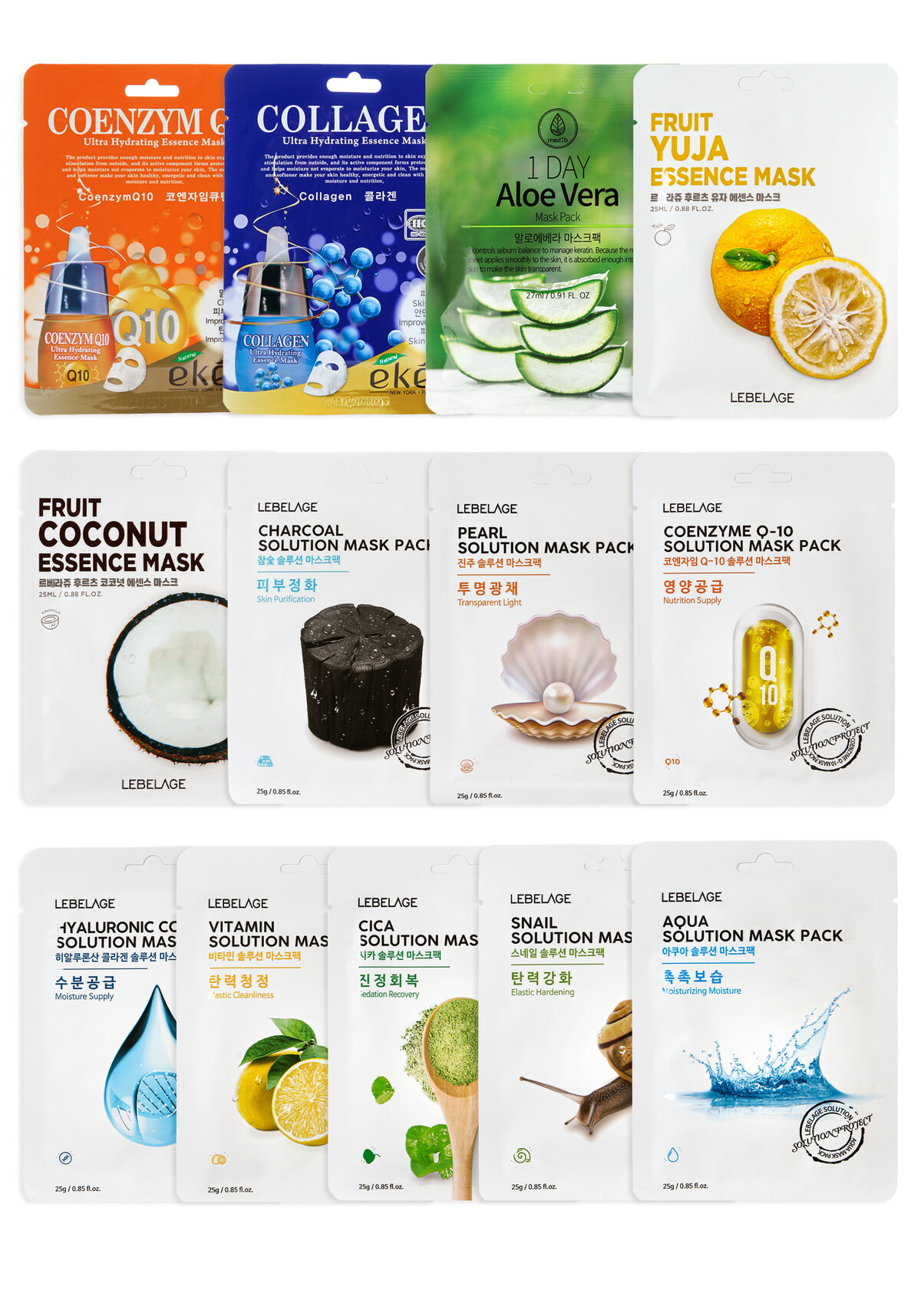 Набор состоит из:1) Тканевая маска для лица гиалуроновая кислота2) Тканевая маска для лица древесный уголь3) Тканевая маска для лица с жемчугом4) Тканевая маска для лица КОЭНЗИМ Q105) Тканевая маска для лица МОРСКАЯ ВОДА6) Тканевая маска для лица МУЦИН УЛИТКИ7) Тканевая маска для лица с витаминами8) Тканевая маска для лица с ЦЕНТЕЛЛОЙ АЗИАТСКОЙ9) Тканевая маска для лица с экстрактом юдзу10) Тканевая маска для лица с экстрактом кокоса11) Маска тканевая с коллагеном EKEL12) Маска тканевая с коэнзимом Q10 EKEL13) Тканевая маска для лица с алоэ LEBELAGE