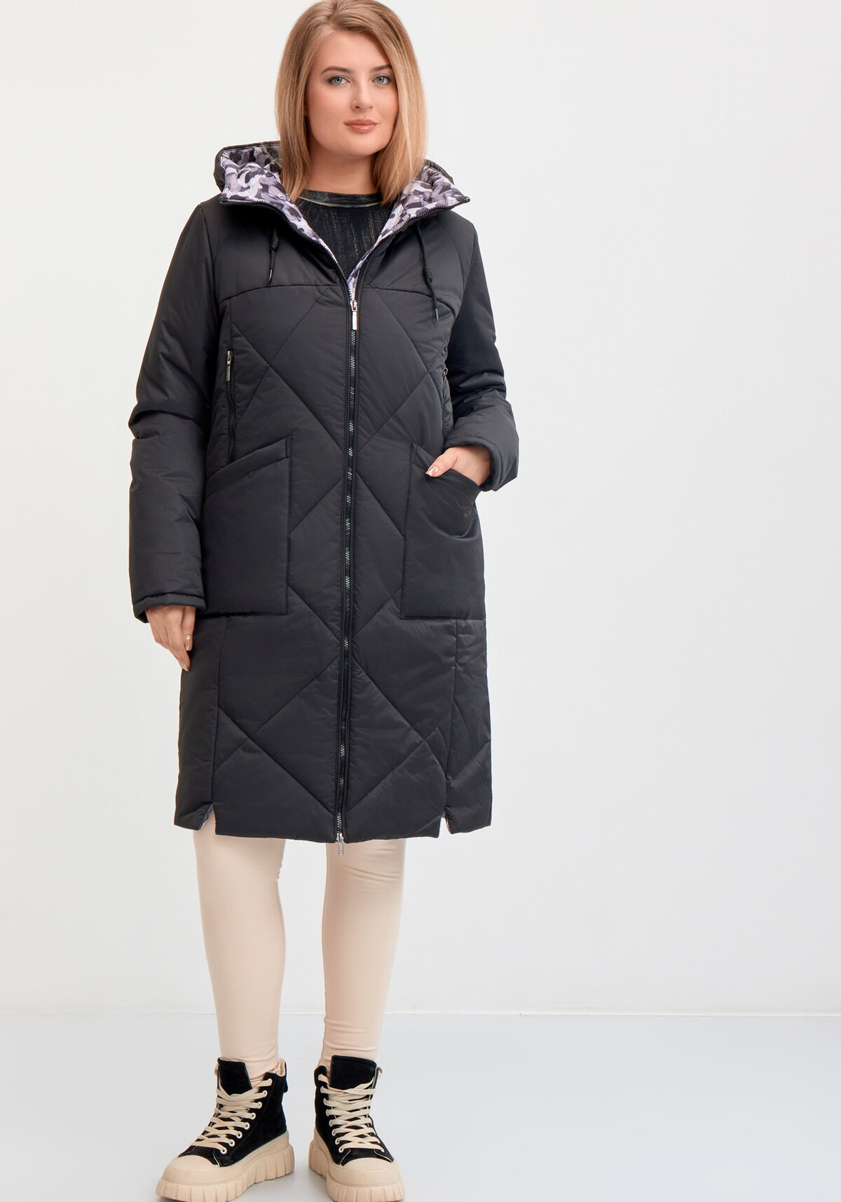 Элегантное зимнее пальто средней длины прямого силуэта с застежкой на двухзамковую молнию. Воротник-стойка, переходящий в регулируемый капюшон. Для удобства пользования в пальто обработаны две пары функциональных карманов — прорезные на молнии и накладные. Есть внутренний кармашек на молнии. Низ втачного рукава оформлен трикотажной манжетой, что позволяет удерживать тепло внутри изделия. Плащевая ткань, из которой выполнено пальто, имеет водоотталкивающую пропитку, выдерживающую небольшой дождь, снег и ветер. Хорошо зарекомендовавший себя утеплитель "Холлофайбер", плотностью 300 г/м, защитит от холода. Температура комфорта: от -20 до 0.