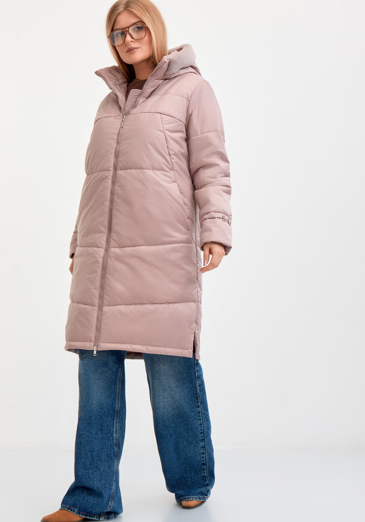 Зимнее пальто средней длины прямого силуэта с декоративными разрезами по бокам. Застежка на двухзамковую молнию. Воротник – уютная стойка, переходящая в капюшон. В пальто обработаны две пары удобно расположенных карманов, которые застегиваются на кнопки. Есть и потайной карман на молнии. Низ втачного рукава оформлен трикотажной манжетой, что позволяет удерживать тепло внутри изделия. Прямой силуэт можно скорректировать затяжкой на талии, увеличив тем самым прилегание по спинке. Опушка из приятного на ощупь искусственного меха добавляет привлекательности и элегантности. Мех не отстегивается, но хорошо стирается и не теряет свой красивый внешний вид после высыхания. Плащевая ткань, из которой выполнено изделие, имеет водоотталкивающую пропитку, выдерживающую небольшой дождь, снег и ветер. Температура комфорта от -20 до 0.