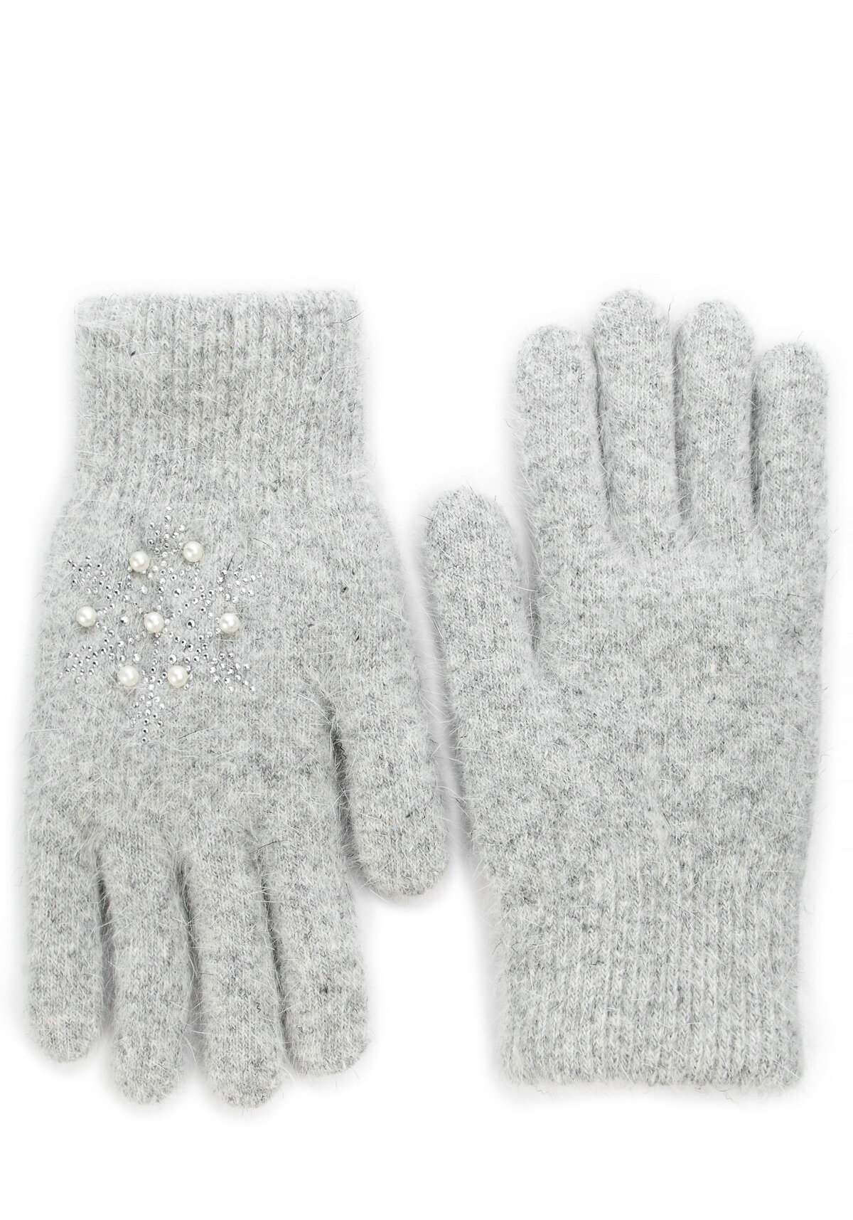 Вязаные перчатки с декором из маленьких страз и жемчужинок в виде снежинок. Температурный режим до -25 градусов.