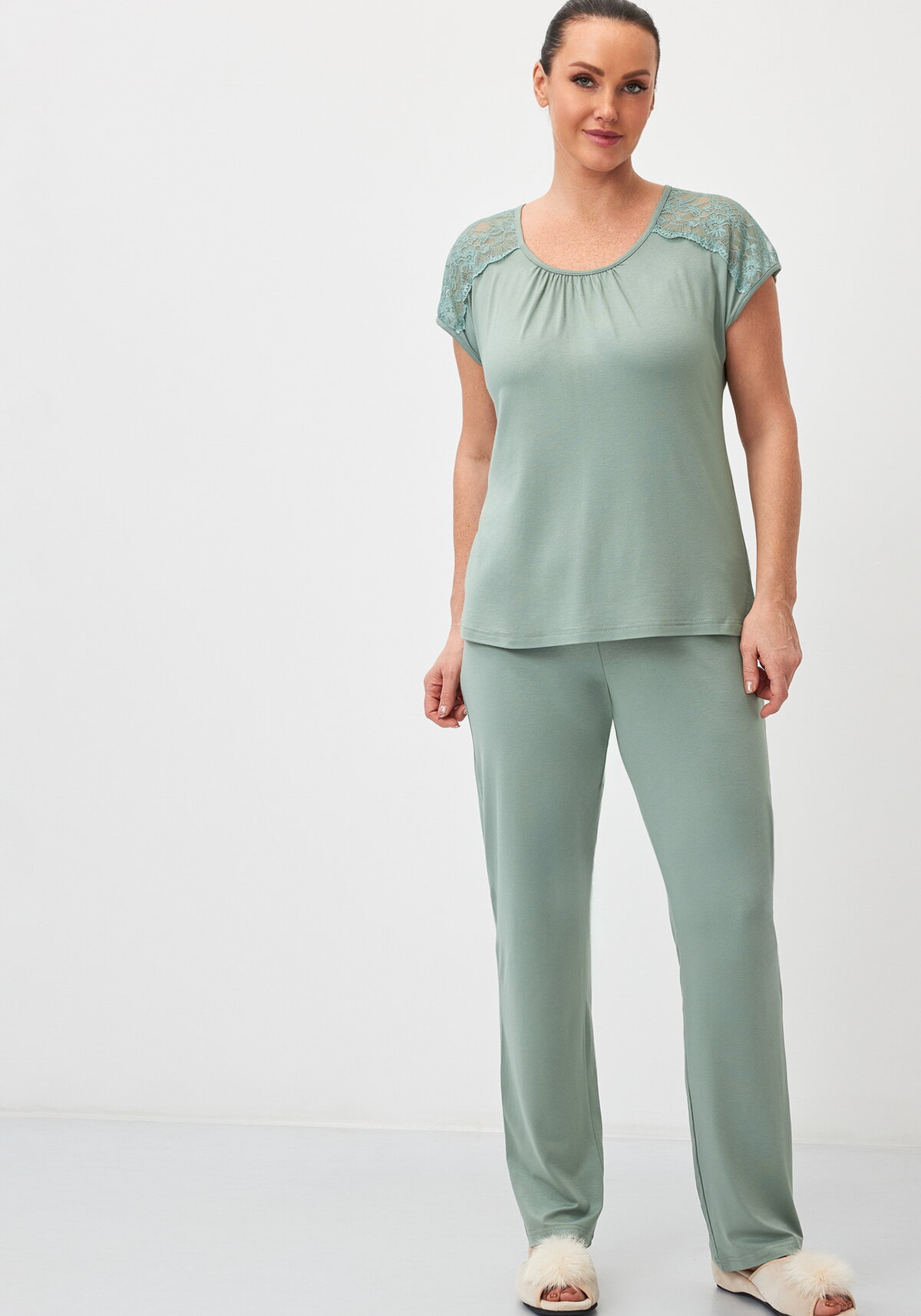 Пижама состоит из туники и брюк. Туника слегка расклешена к низу. Рукав-кимоно. Плечевая кокетка из кружева переходит на рукав. По середине линии горловины переда небольшая сборка. Брюки прямые, по талии резинка.