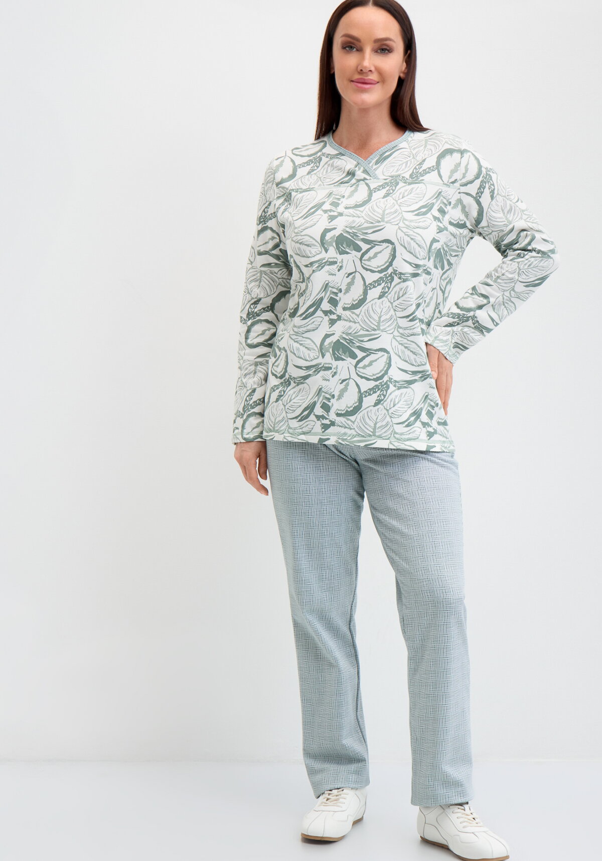 Пижама из футера с начесом состоит из двух предметов, лонгслива и брюк. Лонгслив полуприлегающего силуэта. Рукав втачной полной длины. Полочка с кокеткой над грудью. Детали кокетки на запах. Горловина обработана окантовкой из отделочного материала. Брюки из футера с начёсом полуприлегающего силуэта, полной длины. Пояс цельнокроенный на резинке.