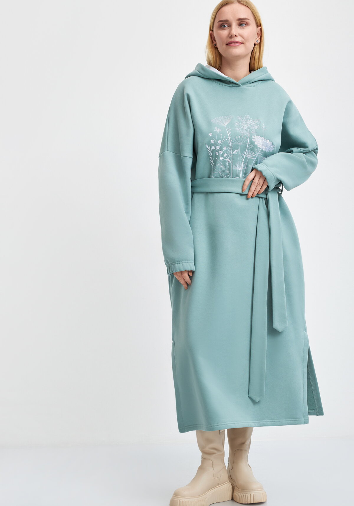 Платье из однотонного трикотажного полотна-футер, свободного силуэта, длиной ниже икр. Спинка и полочка без конструктивных линий. Плечи спущенные, рукава длинные, одношовные с эластичной лентой в низу. В боковых швах располагаются шлёвки, внутренние карманы и разрезы. Капюшон с подкладкой из основного или подкладочного полотна. Пояс съёмный с заостренными концами. На груди вышивка.