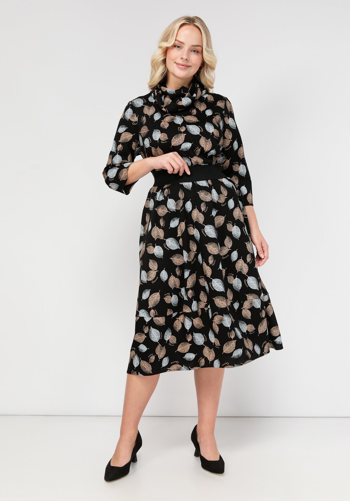 Очаровательное вискозное платье длины миди с интересным принтом и воротником-хомутом. Полуприлегающий силуэт подчеркивает достоинства фигуры и маскирует недостатки. Элегантный рукав 3/4. Функциональные карманы.