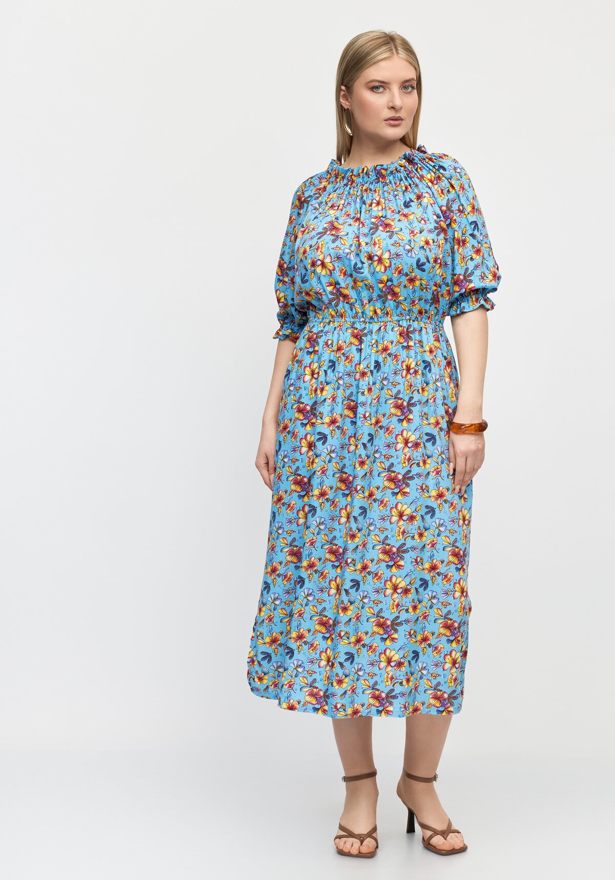 Изящное платье с нежным цветочным принтом очарует вас с первого взгляда — модель с открытыми плечами и рукавом 3/4 с эластичными манжетами подчёркивает женственность и дарит абсолютный комфорт. Благодаря удачному составу (80% вискоза и 20% лавсан) ткань приятно облегает фигуру и отлично тянется, обеспечивая свободу движений без малейшего дискомфорта. Практичные прорезные карманы и стильные боковые разрезы добавляют модели изюминку и функциональность — создайте лёгкий романтичный образ для тёплых дней!