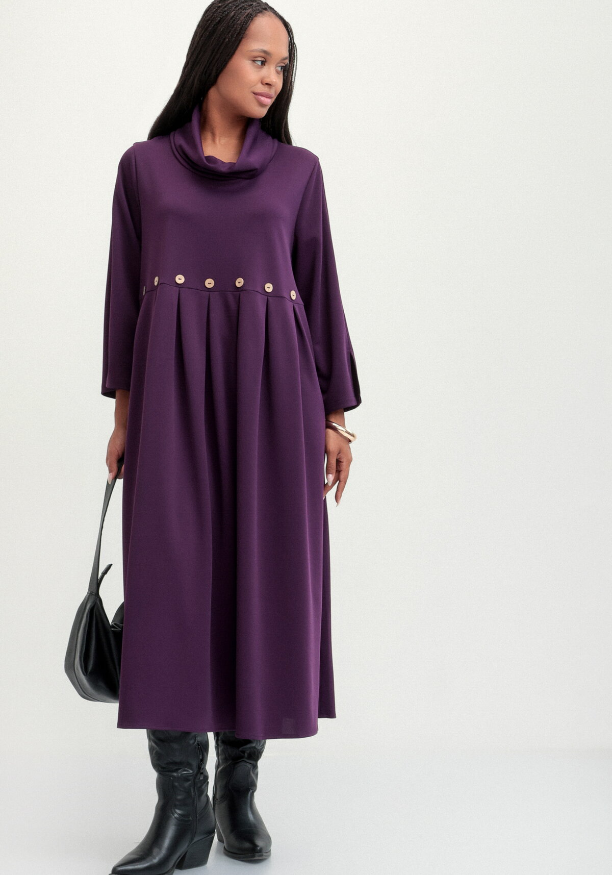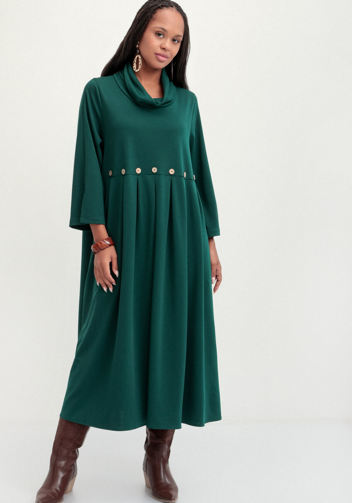 Платье миди свободного кроя с отрезной кокеткой и юбкой со складками. Горловина хомут, рукава 7/8 с разрезом и боковой карман. Комфортный и элегантный силуэт для повседневных образов.