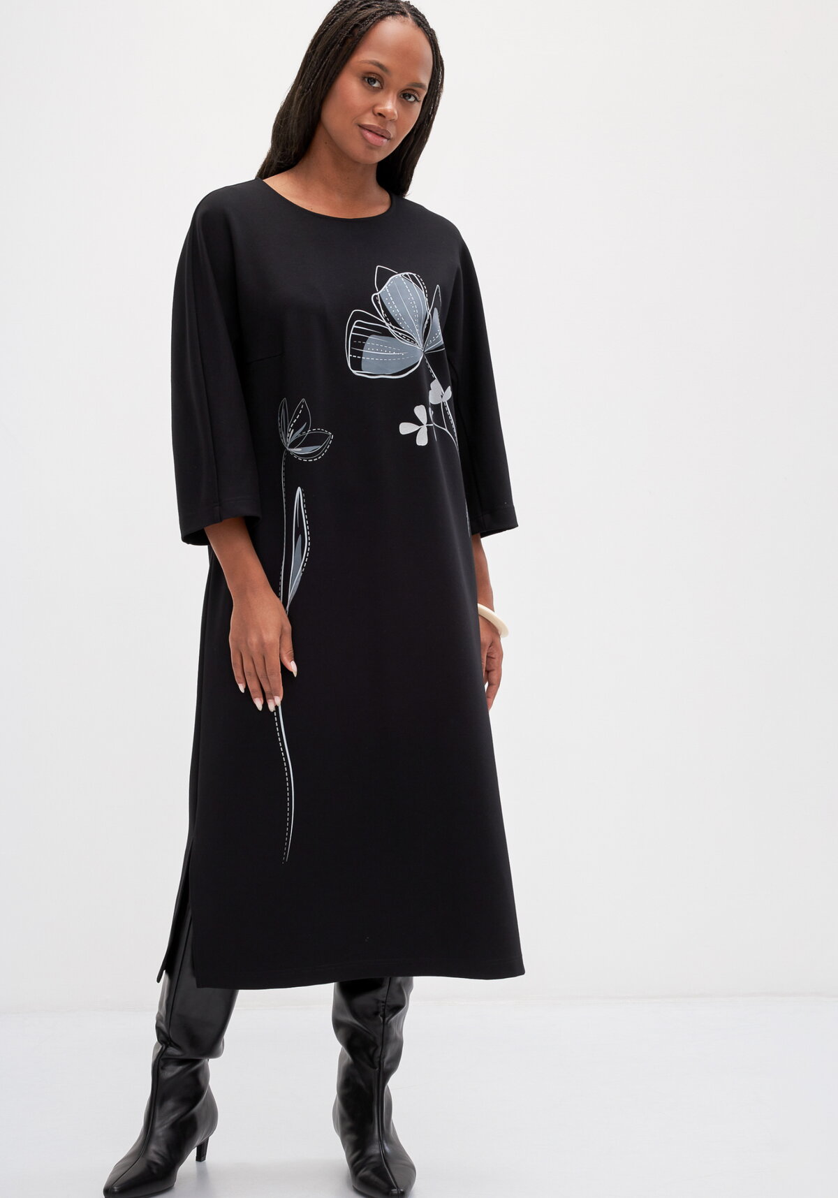 Платье-футляр из гладкокрашеного трикотажного полотна с принтом. Рукава 3/4. Модель подходит на все типы фигуры.