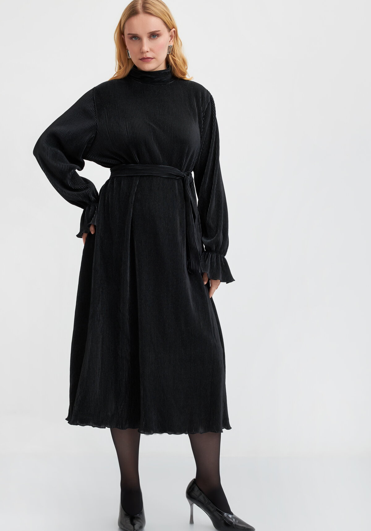 Платье прямого силуэта из трикотажной ткани с эффектом "гофре". Вырез горловины круглый с воротником-стойка. По спинке застёжка на 1 пуговицу. Рукава втачные полной длины, по низу на резинке с воланом. В комплект входит пояс и подъюбник.