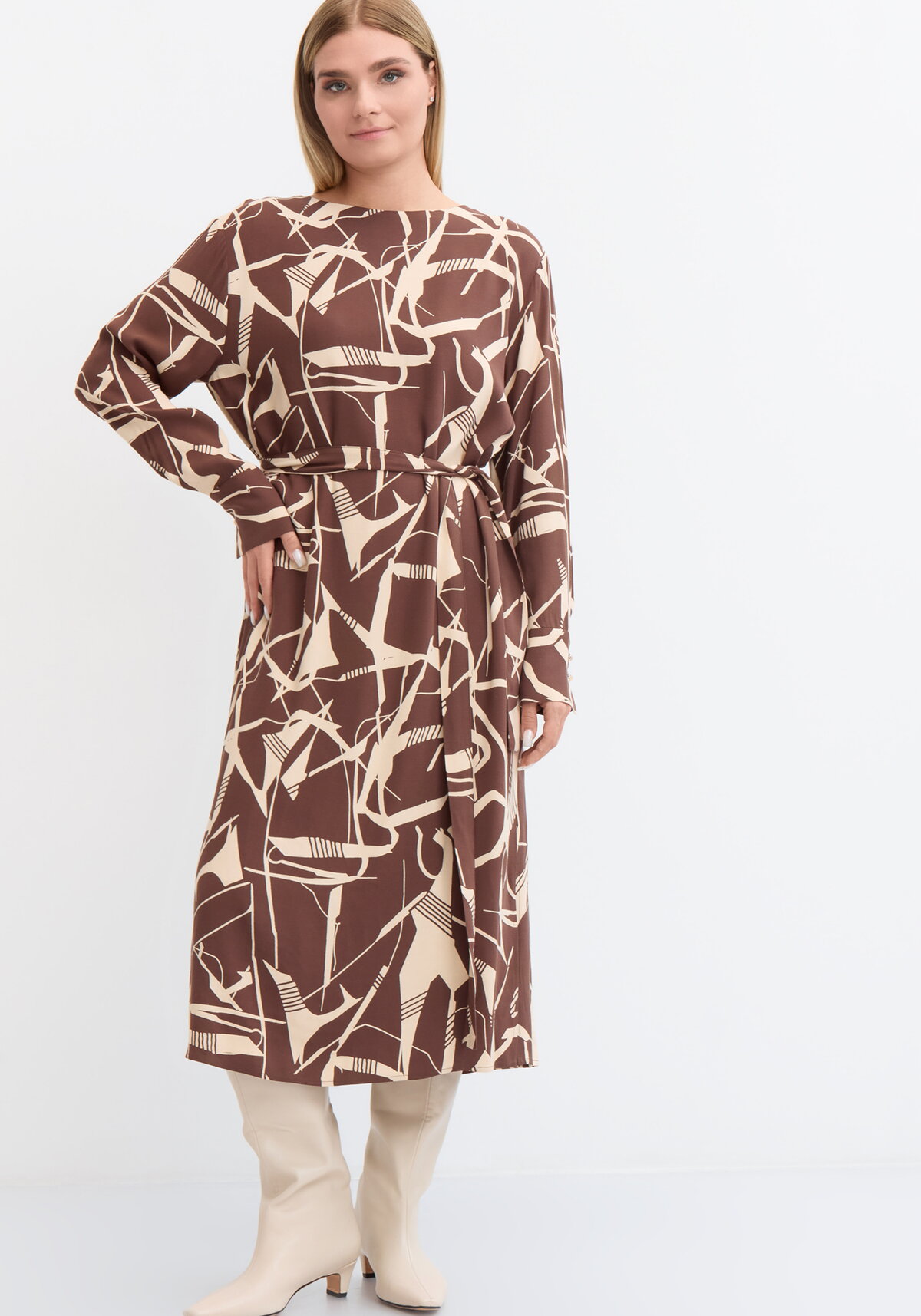 Платье миди прямого силуэта. Втачной рукав со спущенным плечом. Широкая манжета с акцентными пуговицами. Разрезы в боковых швах. Застежка на пуговицу по спинке. В комплекте к платью предлагается пояс. Создайте нарядный образ дополнив платье яркими аксессуарами.