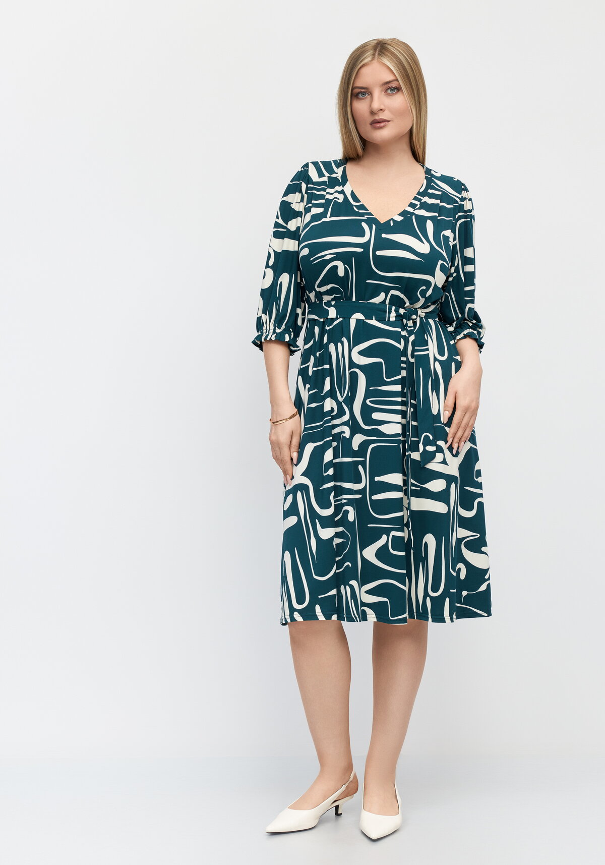 Изысканное платье с абстрактным принтом подчеркнёт вашу индивидуальность и добавит ярких акцентов в любой образ! Модель с V‑образным вырезом и рукавом 3/4 с эластичными манжетами изящно облегает фигуру, а пояс на талии создаёт утончённый силуэт и подчёркивает достоинства. Благородная комбинация вискозы (80%) и лайкры (20%) дарит непревзойдённый комфорт: ткань мягко струится, отлично тянется и не сковывает движений. Выберите этот наряд — и будьте в центре внимания, где бы вы ни находились!