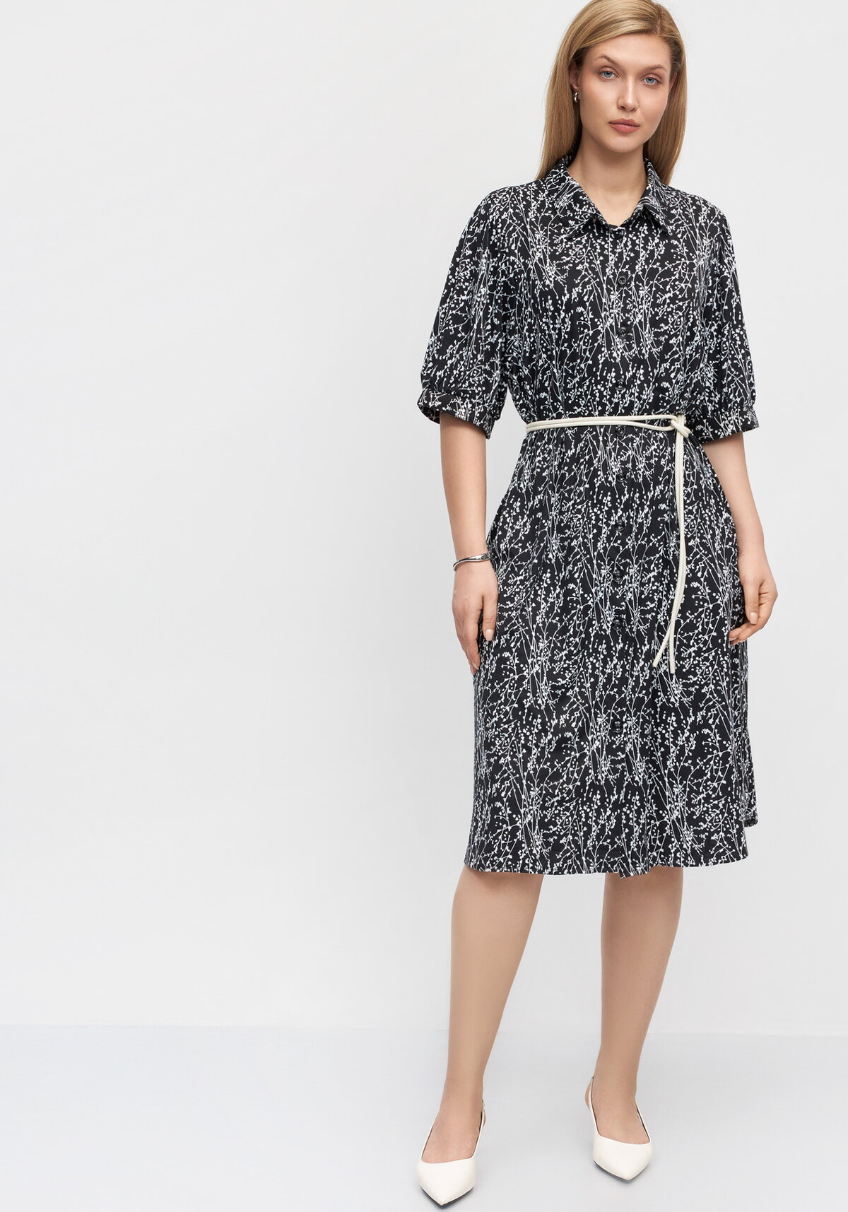 Платье имеет прямой свободный крой и застежку на пуговицы по всей длине. Модель дополнена отложным воротником и рукавами длиной 3/4. Такая конструкция делает платье удобным и универсальным предметом гардероба.