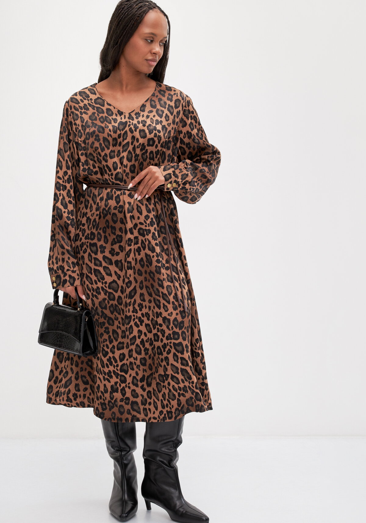 Платье с принтом из вискозы. Длина платье ниже колена, длинный рукав с манжетом на две пуговицы. Отделочная деталь — чокер черного цвета с цветком. Для повседневного и праздничного гардероба.