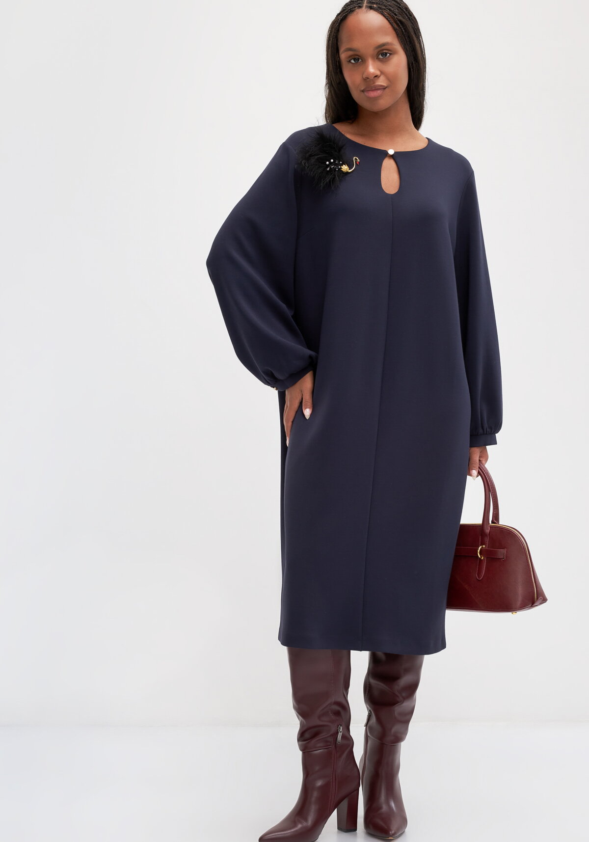 Платье-футляр из гладкокрашеного трикотажного полотна. Капелька на пуговице, брошь в комплекте. Модель подходит на все типы фигуры.