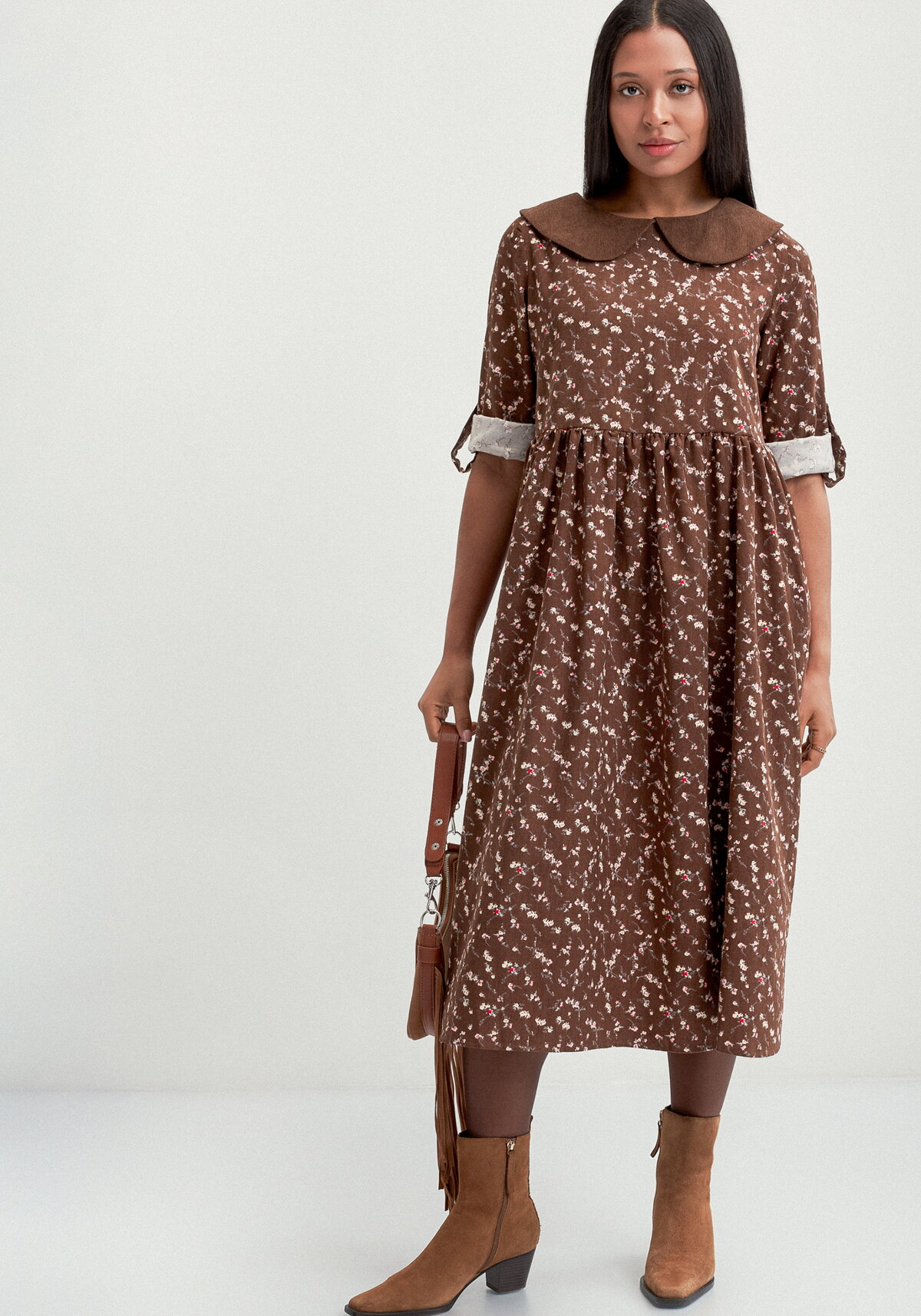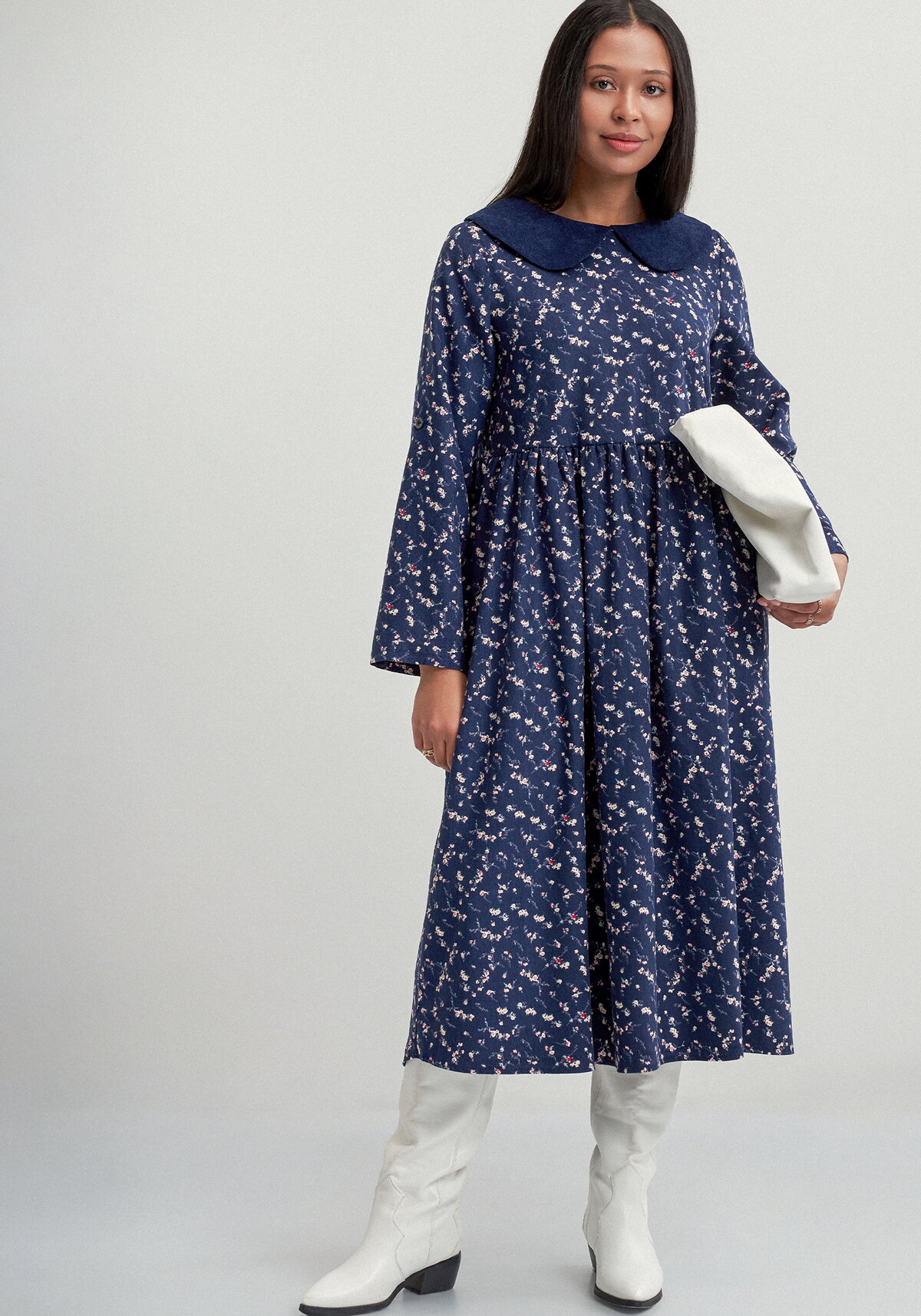 Платье оверсайз А-силуэта. Отрезное чуть выше линии талии. Юбка на сборке. Круглый вырез горловины с плосколежащим воротником округлой формы. Рукава втачные с патами по низу.