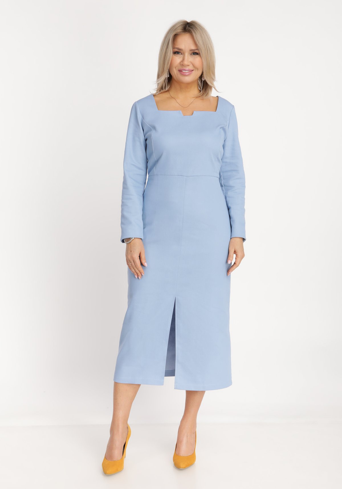 Стильное базовое платье из натурального хлопка с фигурной горловиной. Изящный приталенный силуэт. Разрез спереди для дополнительного комфорта при ходьбе. Пастельные тона. Отличный повседневный вариант, который можно легко превратить в вечерний, добавив яркие аксессуары.