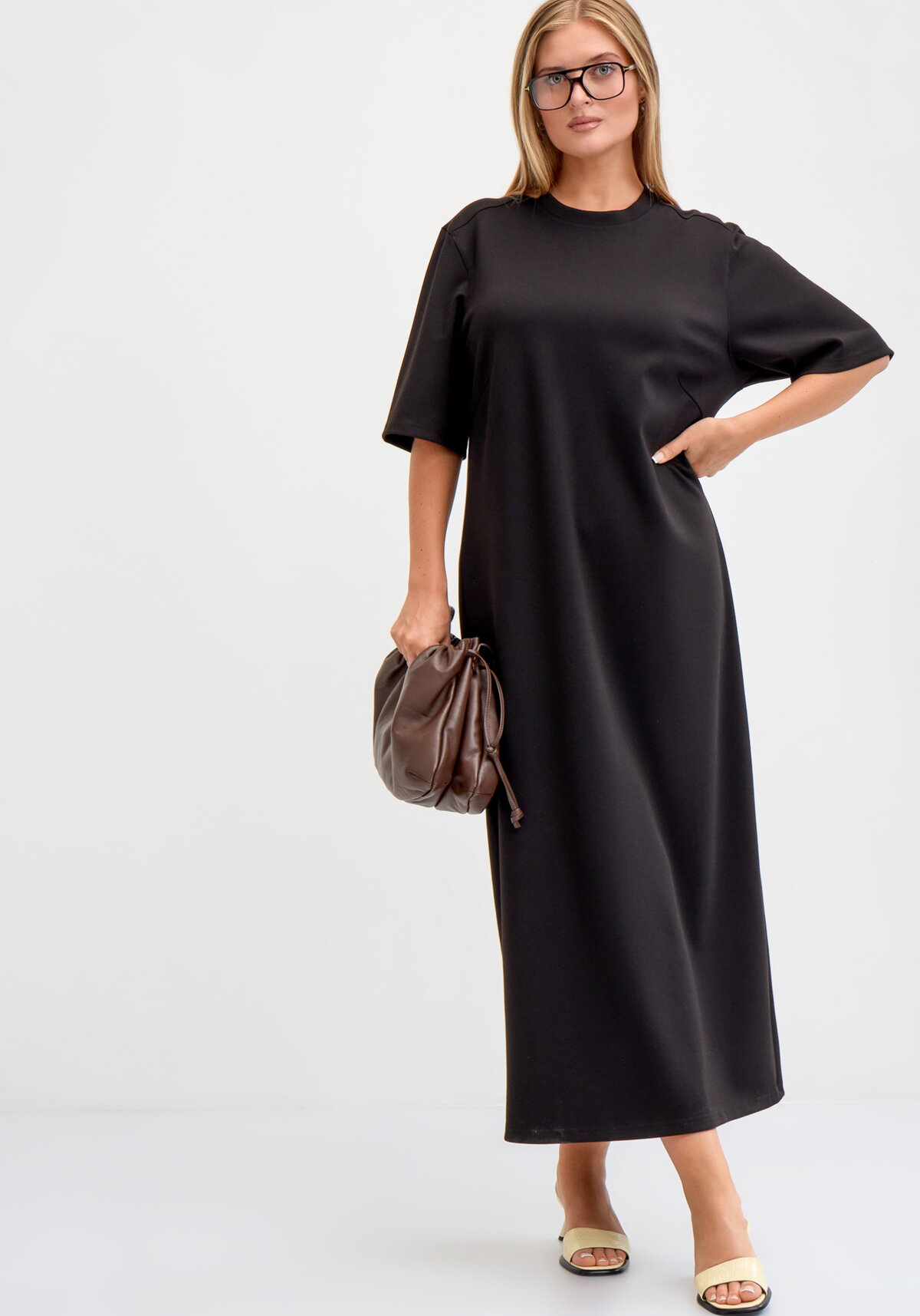 Платье приталенного силуэта, длиной ниже икр, из трикотажного полотна. Вырез горловины круглый, с притачной бейкой. На спинке средней шов и кокетка. Модель представлена в трех цветах: черный, темно-синий, коричневый.