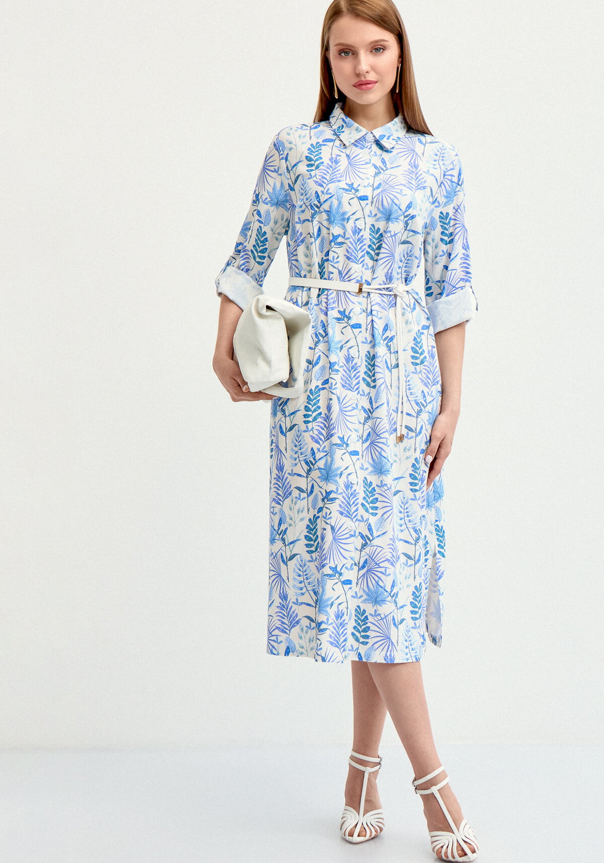 Платье-рубашка свободного покроя. Воротник рубашечный. Рукав втачной с патой. По боковым швам разрезы. Карманы в боковых швах. Модель представлена в двух цветах: оливковый и голубой.
