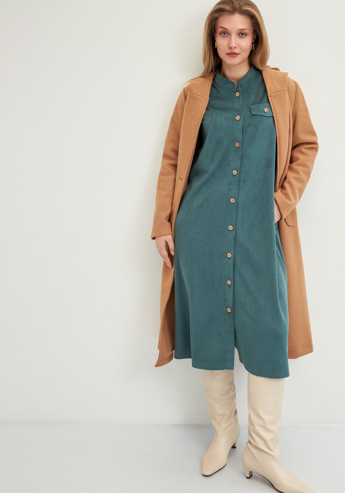 Платье А-силуэта. Рукава полной длины с манжетами. Однобортная застежка. Воротник-стойка. Спинка отрезная чуть выше линии талии, нижняя часть плиссированная. Карманы в боковых швах.