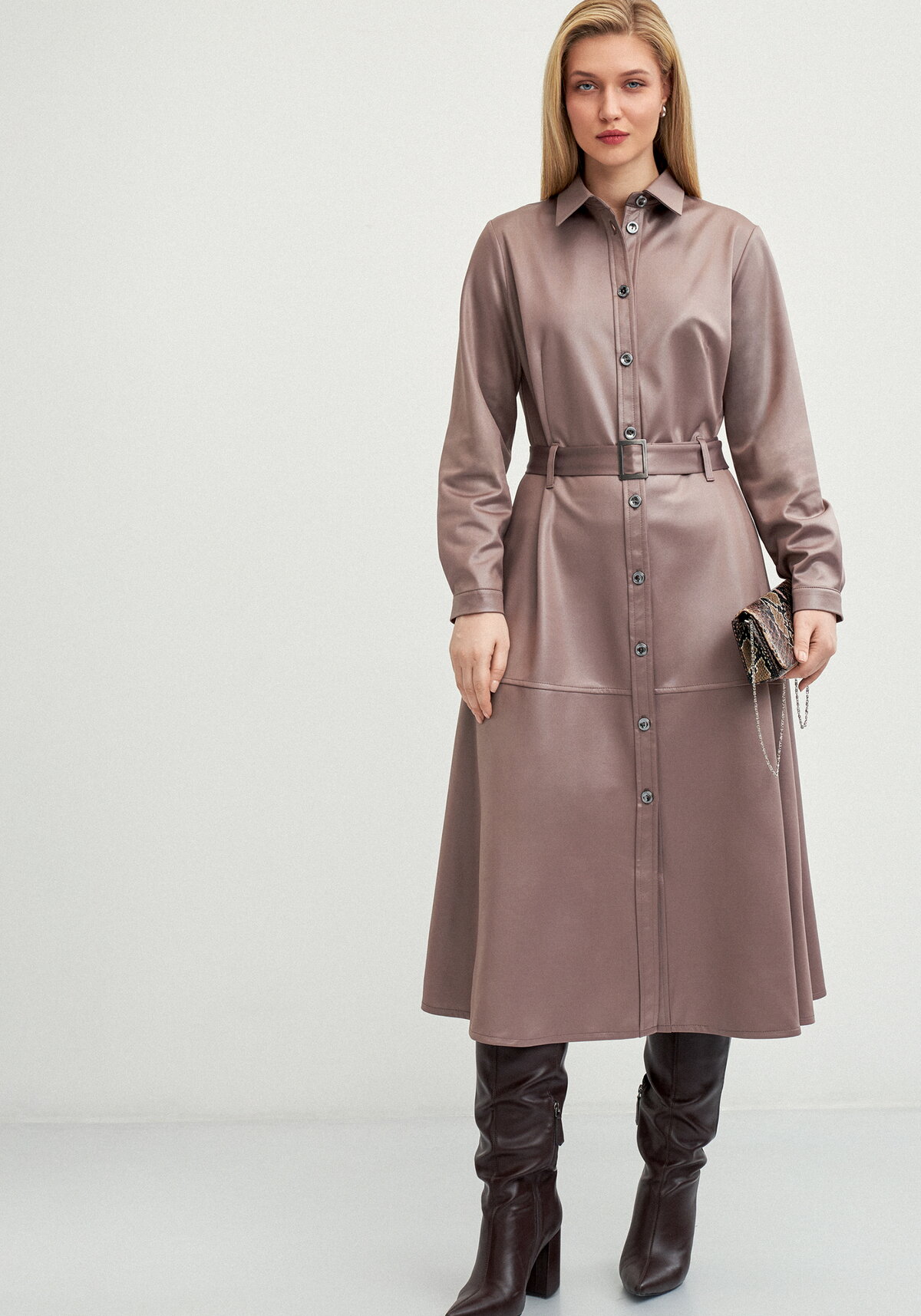 Платье‑рубашка с отрезным силуэтом по талии и линии бедра создает выразительный женственный образ. Рубашечный воротник с планкой на пуговицах по переду и втачной рукав с манжетой на пуговице придают модели классический шарм. Декоративные отстрочки по планке и подрезу низа юбки дополняют дизайн, а пояс на пряжке позволяет подчеркнуть линию талии и завершить ансамбль.
