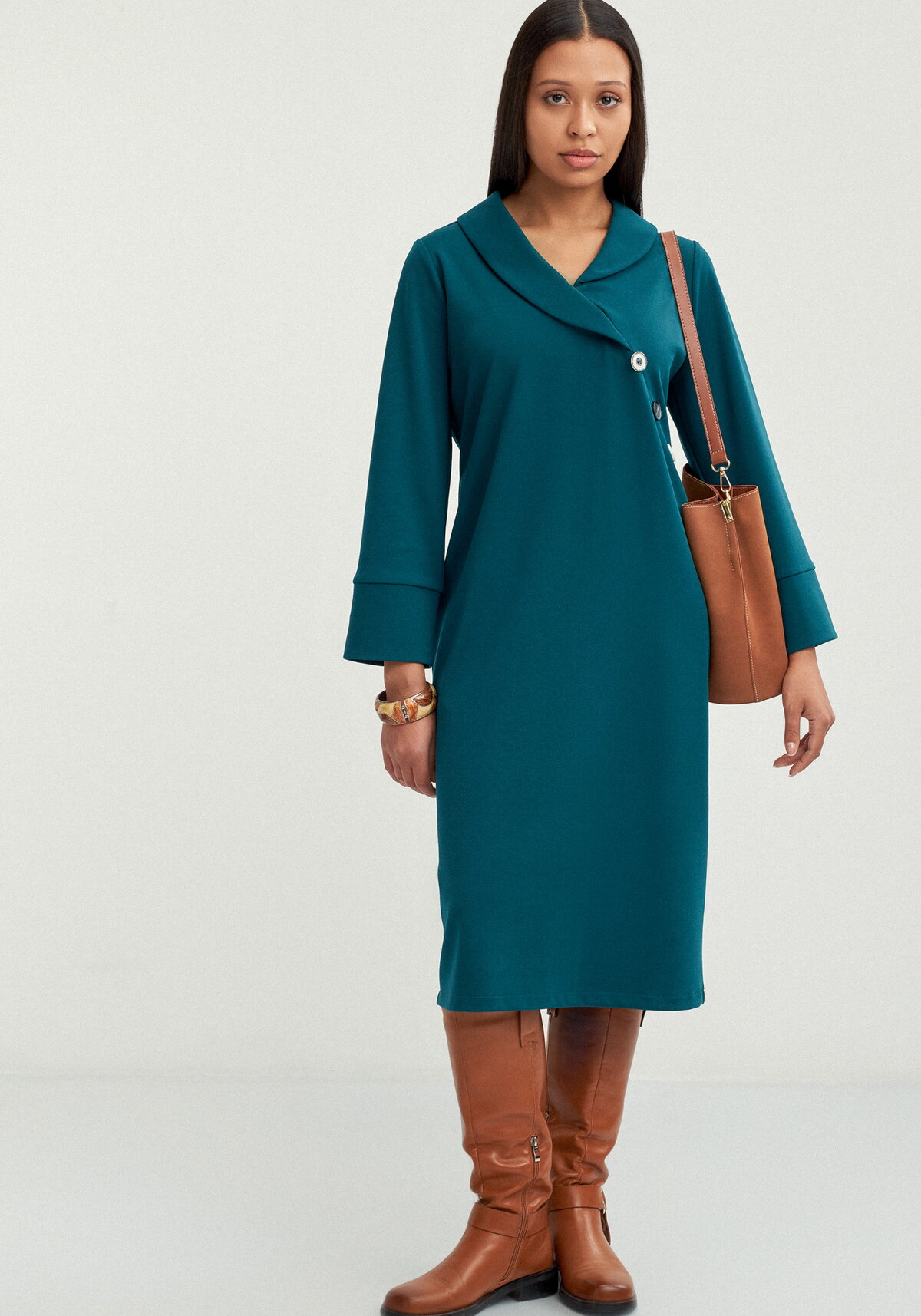 Элегантное платье миди в бочкообразном силуэте — идеальный выбор для стильного образа! V-образная горловина с изысканным воротником "шалька" подчеркивает линию шеи. Рукав длиной 7/8 с манжетой и отворотом добавляет модели утонченности.