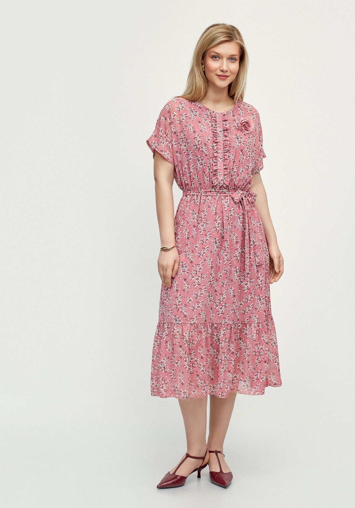 Очаруйте окружающих изысканным платьем с нежными рюшами и утончённым цветочным декором — оно создано, чтобы подчеркнуть вашу женственность и добавить образу романтического настроения. Нежная рюша на полочке деликатно акцентирует внимание на верхней части силуэта, а декоративное украшение в форме цветка придаёт модели особый шарм и изысканность. Цветочный принт наполняет образ лёгкостью и весенней свежестью, а короткий рукав обеспечивает комфорт в тёплые дни. Волан по низу юбки придаёт платью игривость и динамику, изящно колышусь при каждом движении. Пояс на талии поможет подчеркнуть изящные линии фигуры — с этим платьем вы будете выглядеть безупречно в любой ситуации!