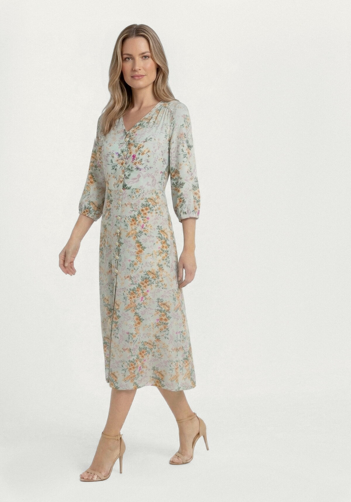 Изящное платье с нежным цветочным принтом и элегантными пуговицами подарит вам ощущение лёгкости и комфорта: мягкая вискоза (60 %) приятно прилегает к коже, а полиэстер (40 %) помогает сохранить безупречный силуэт и насыщенность красок на долгое время. V‑образный вырез и рукав 3/4 подчёркивают женственность образа, деликатно акцентируя внимание на линиях силуэта, а аккуратный разрез спереди добавляет модели утончённости и свободы движений. Этот наряд станет настоящей находкой для создания романтичных и повседневных луков — он легко сочетается с разной обувью и аксессуарами, позволяя каждый раз выглядеть по‑новому.