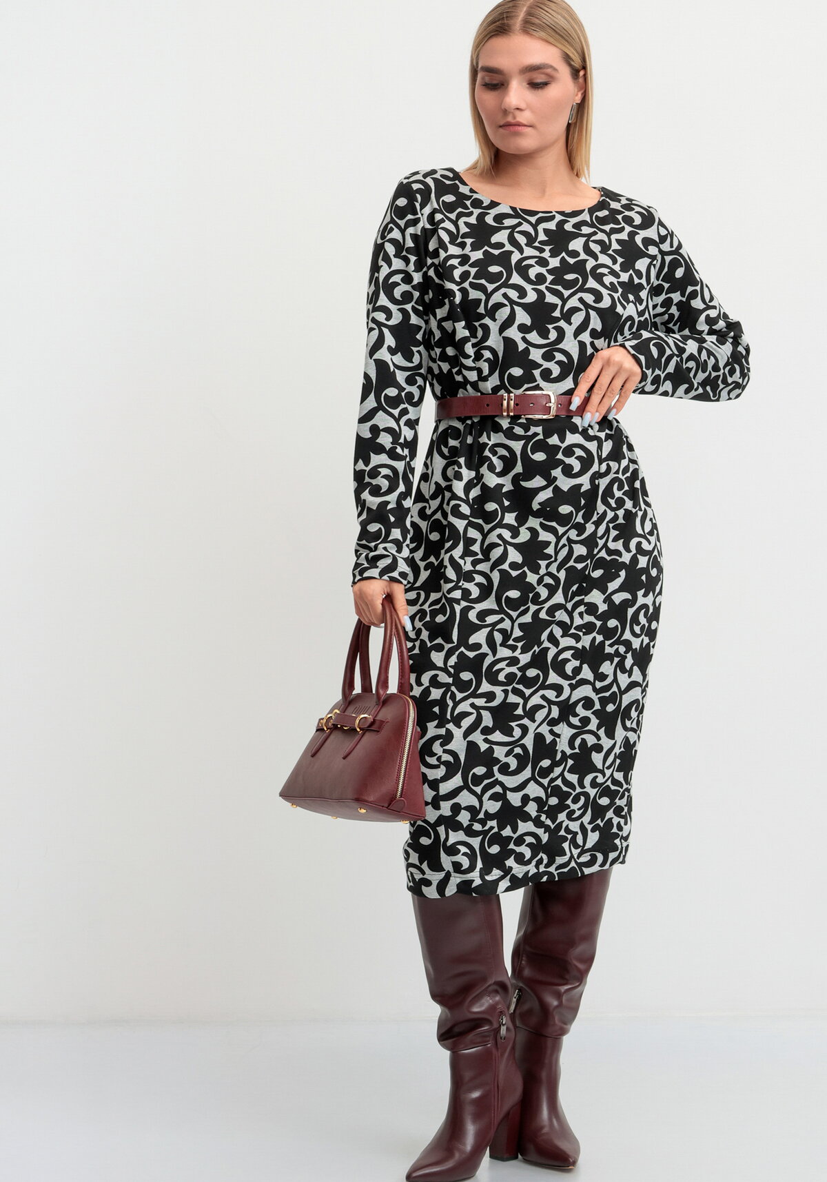 Классическое платье-футляр полуприлегающего силуэта. По полочке и спинке рельефные швы. Вырез горловины круглый, рукав втачной длинный. Без карманов и застежки. Длина — 105-118 см. Размер выбирайте по большему объему груди или бедер. Модель представлена в двух цветах: сине-белый и серо-черный.