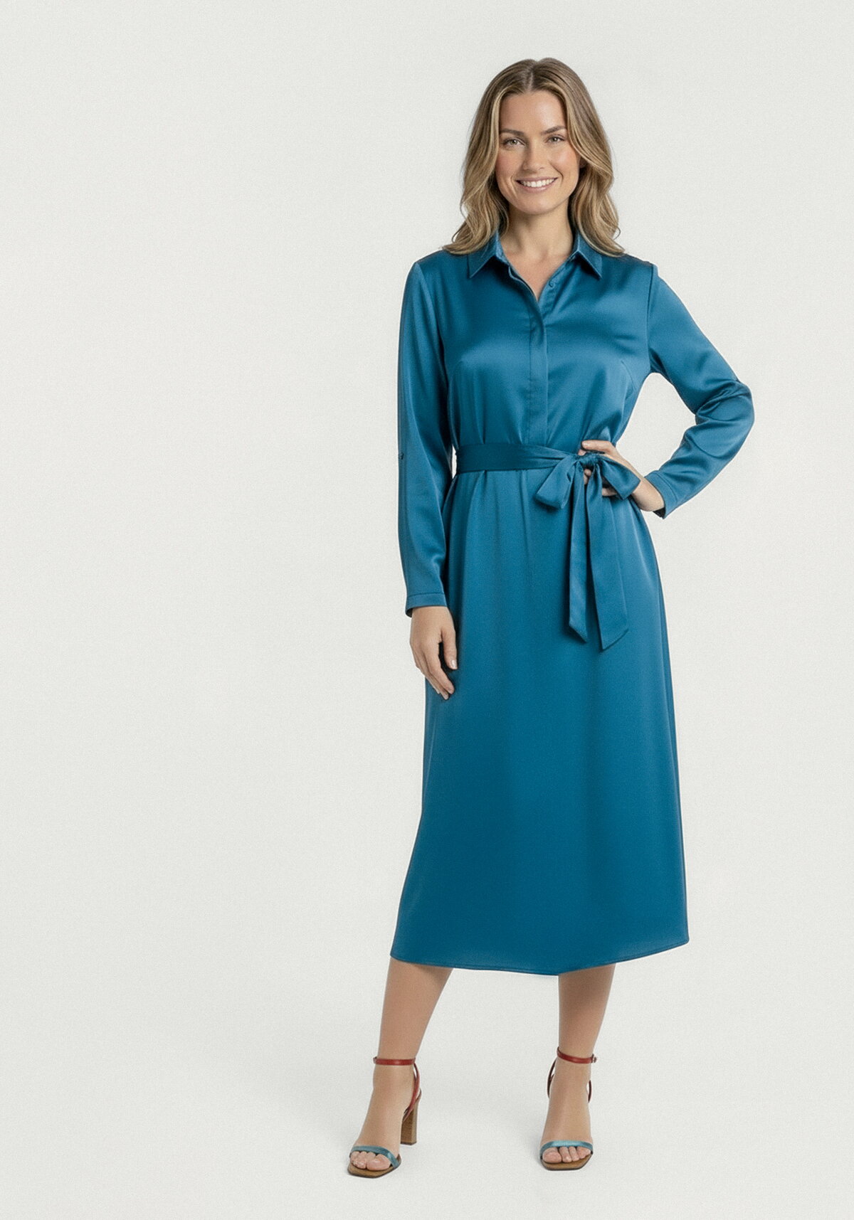 Изящное прямое платье из благородного микса тканей покорит вас с первого прикосновения: шёлк и вискоза (по 20 %) дарят невесомость и деликатный блеск, а 60 % полиэстера надёжно сохраняют безупречную форму и яркость цвета даже после множества носок. Элегантный отложной воротник и застёжка на пуговицы подчёркивают утончённость модели, а пояс на талии позволяет подчеркнуть силуэт и создать женственный образ. Универсальный крой и продуманные детали делают это платье идеальным выбором для самых разных случаев — от деловых встреч до светских мероприятий.