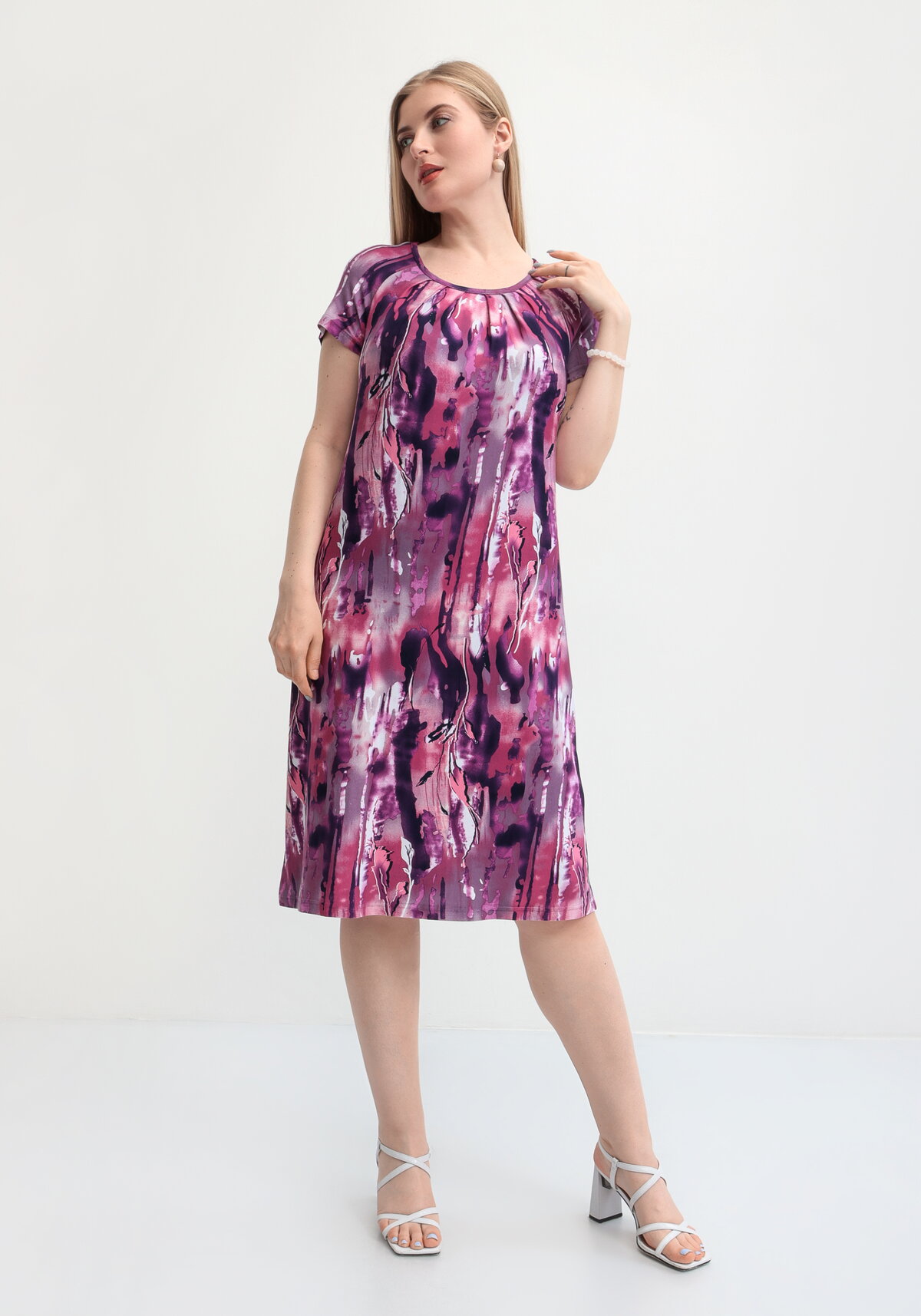 Платье А-силуэта с защипами по горловине и рукавом-реглан. Выполнено из вискозы и эластана. Модель представлена в четырех цветах: коричневый, сиреневый, синий, бирюзовый.