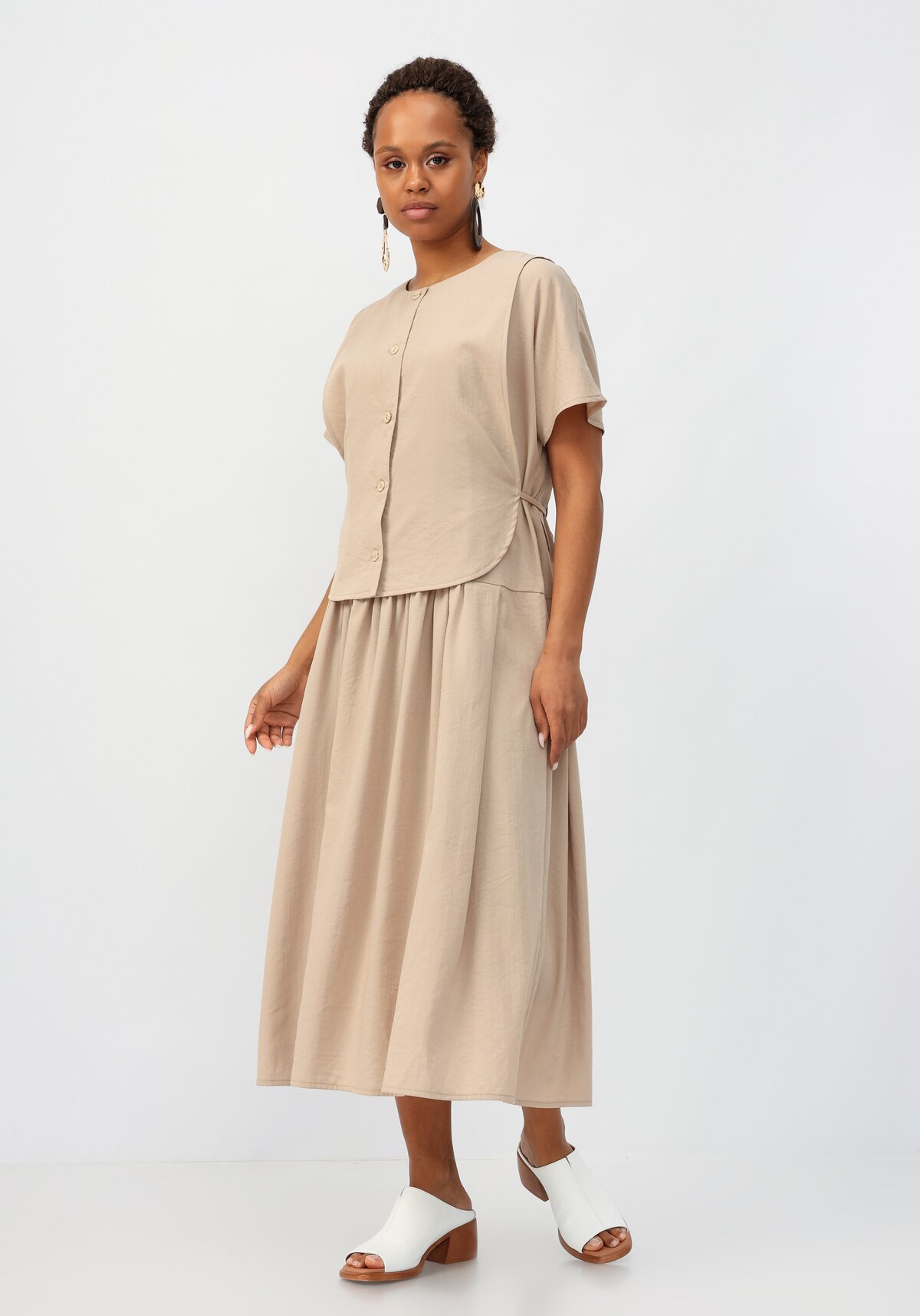 Платье в стиле оверсайз. Спущенный рукав. Заниженная талия. Круглая горловина. Жилет прямого силуэта на поясе, который завязывается сзади. Жилет застегивается на пуговицы спереди.