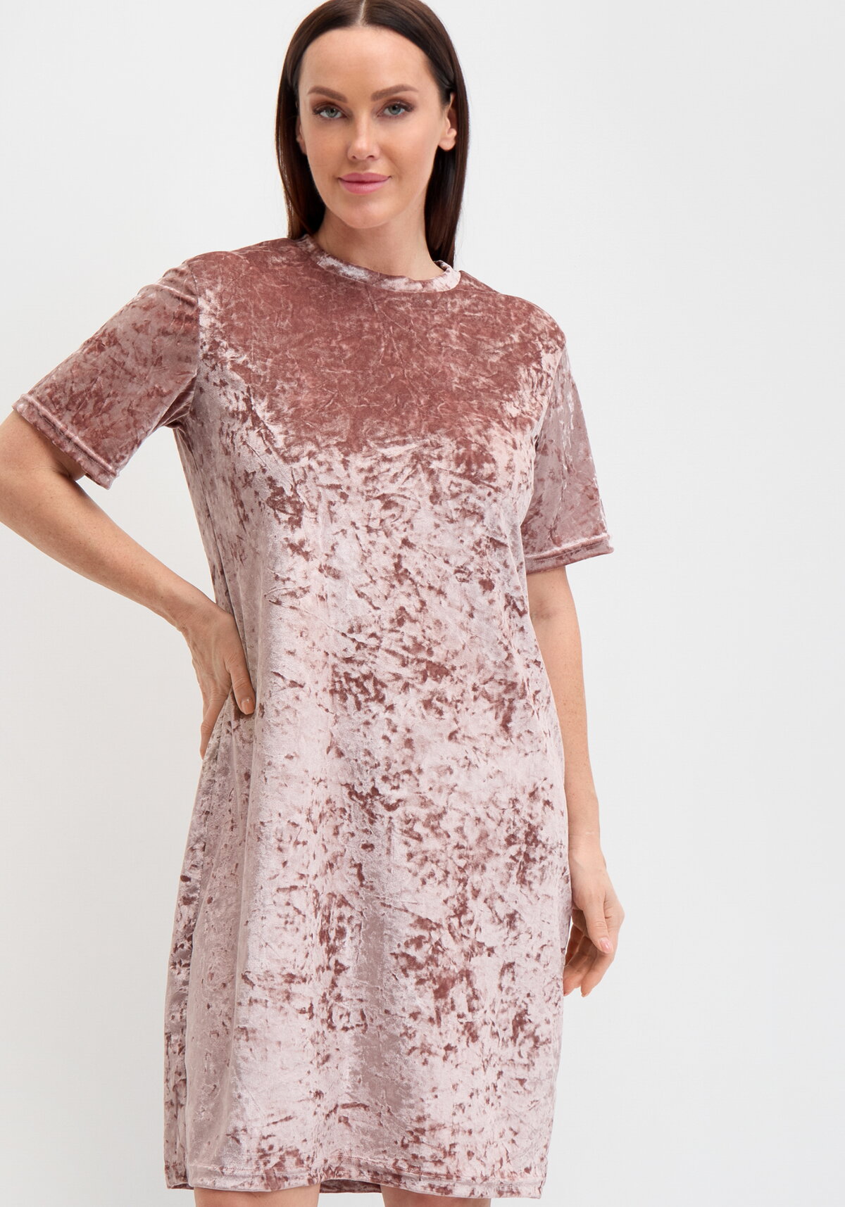 Платье из бархата-крэш с эффектом помятой текстуры. Платье полуприлегающего силуэта длиной до колена. Рукав втачной короткий. Круглый вырез горловины.