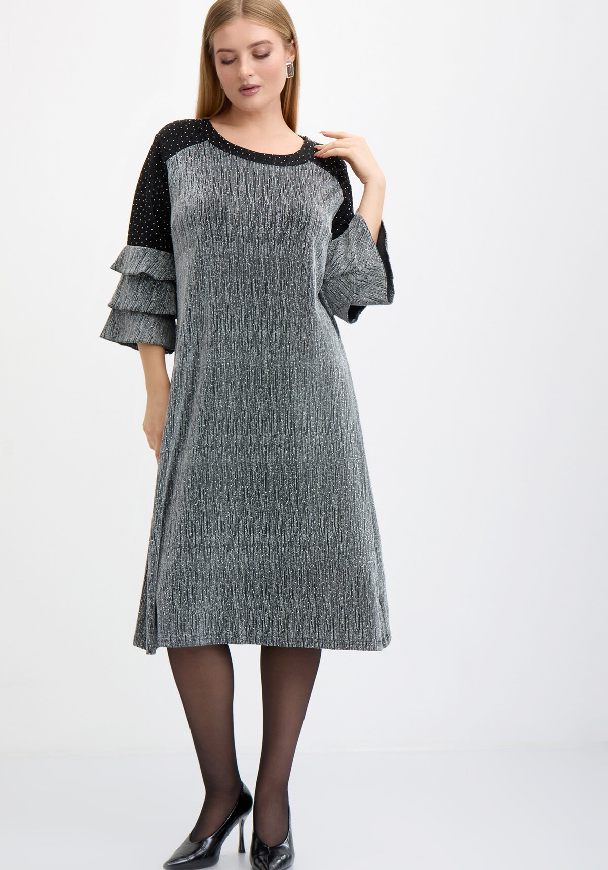Платье оверсайз А силуэт. Круглый вырез горловины. Впереди по плечам кокетка. Рукав свободный, отрезной с воланами по низу. Ткань трикотаж с люрексом. Платье без подкладки.