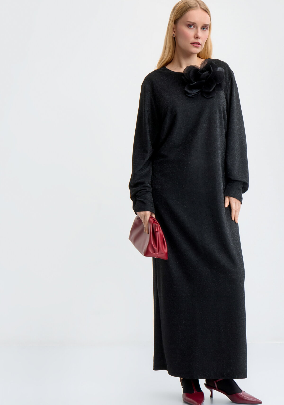 Приталенное трикотажное платье ниже икр с блестками. Горловина с круглым вырезом оформлена обтачкой на клеевой основе. На спинке — шов по центру и кокетка, на передней части — нагрудные вытачки от боков и цельнокроеная кокетка. Длинные втачные рукава с одним швом.